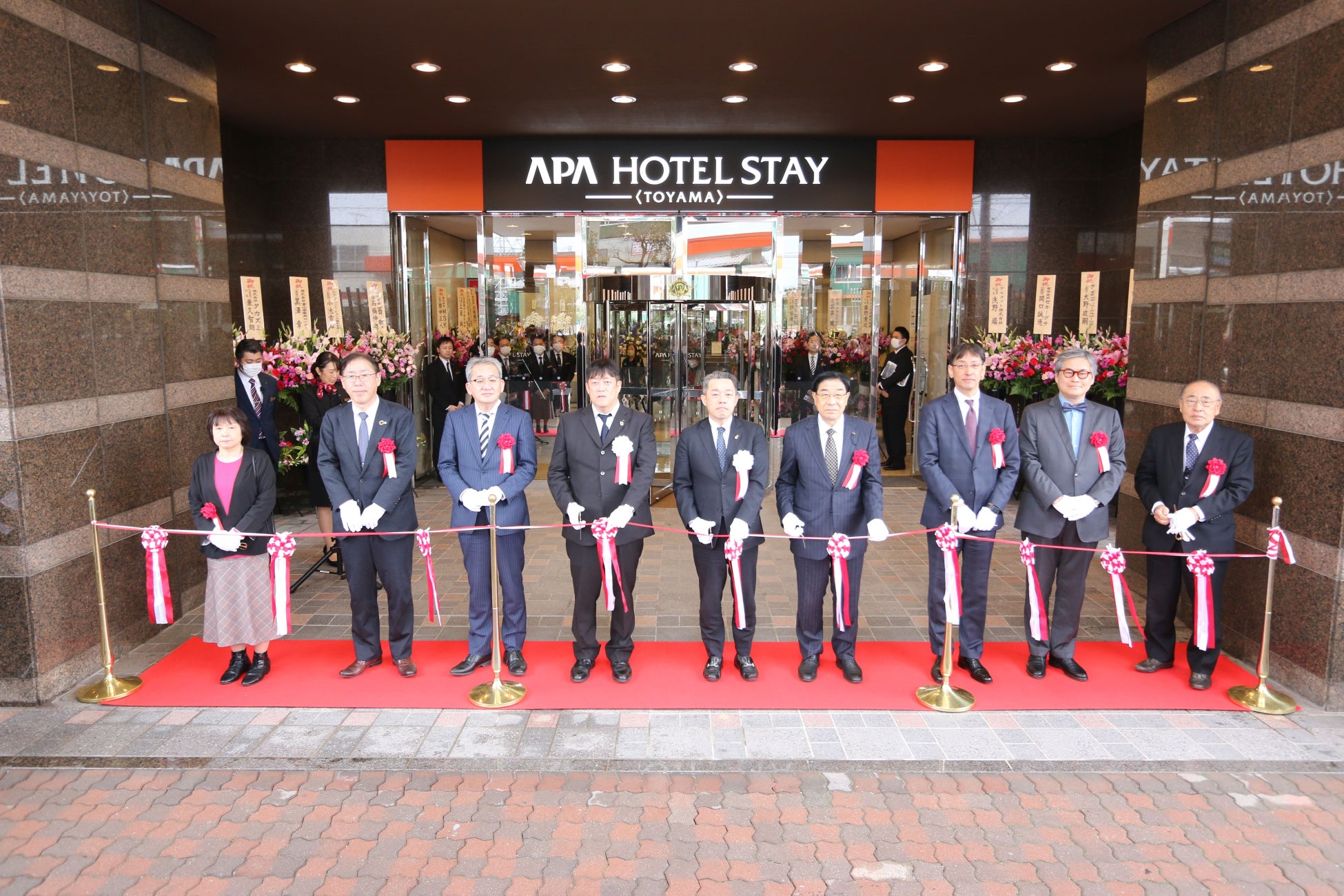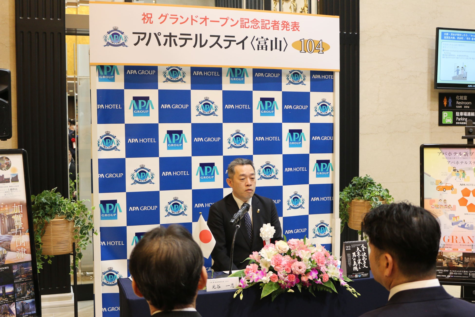 記者発表では、アパグループ社長 兼 最高経営責任者(CEO)元谷 一志は「アパホテル5つ目のブランドとなる『ステイ』ブランドとして、アパホテルステイ〈富山〉を開業できたことを大変嬉しく思う。当ホテルは、コロナ禍において昨年まで約2年間にわたり富山県に宿泊療養施設のため一棟貸しをしており、終了にあたりサウナに特化した施設として大規模なリニューアル工事を施しグランドオープンに至った。アパホテル初となる『オールインクルーシブサービス』を提供するホテルとして、宿泊者は朝食ビュッフェ、サウナ利用、ラウンジでのドリンクサービス、夜食アパ社長カレーなどがすべて無料でお楽しみいただける。宿泊利用だけでなく、客室付きの日帰り利用やサウナのみ利用も可能であり、遠方からだけでなく、地元の方も気軽に利用でき地域に愛される施設を目指していきたい。アパホテルは『1ホテル1イノベーション』を標榜しており、今回は『ステイ』ブランドの誕生が大きなイノベーションではあるが、洗い場のシャワーフックを左側に設置した『左利き対応ブース』や『女性専用ランドリーコーナー』など初めて導入する設備やサービスも数多くあり、随所にイノベーションを感じていただけるホテルとなっている。当ホテル次第では、今後『ステイ』ブランドを全国的に増やしていくことも検討しており、まずは富山にお越しいただきアパの進化を体感してもらいたい。」と述べた。