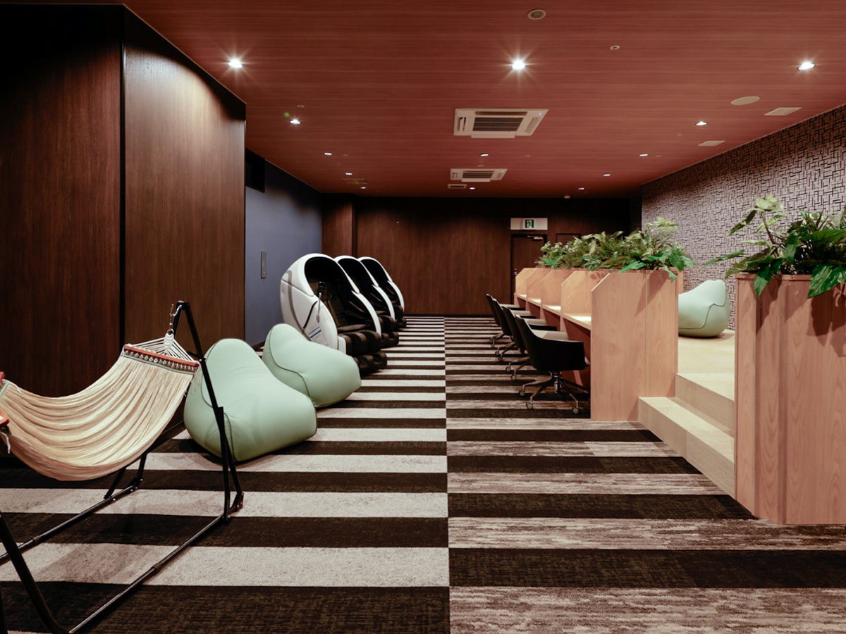 2階には、サウナ後に心と体を癒す空間としてRestspace「麓(Fumoto)」を設置する。人気のマッサージチェア「まるで宇宙旅行!無重力マッサージ あんま王」を無料で利用できるほか、最新のコミックを取り揃えており、週刊誌や雑誌が楽しめる電子書籍(ビューン)も利用できる。また、ランドリー男性4台・女性2台(洗濯機無料・乾燥機有料)を完備しており、長期滞在のゲストの方も安心して滞在することが出来る。さらに、サウナ前後の健康管理にご活用いただける自動血圧計を設置している。Restspace「麓(Fumoto)」は宿泊プランの他に日帰りサウナプランA・Bの方も利用できる。