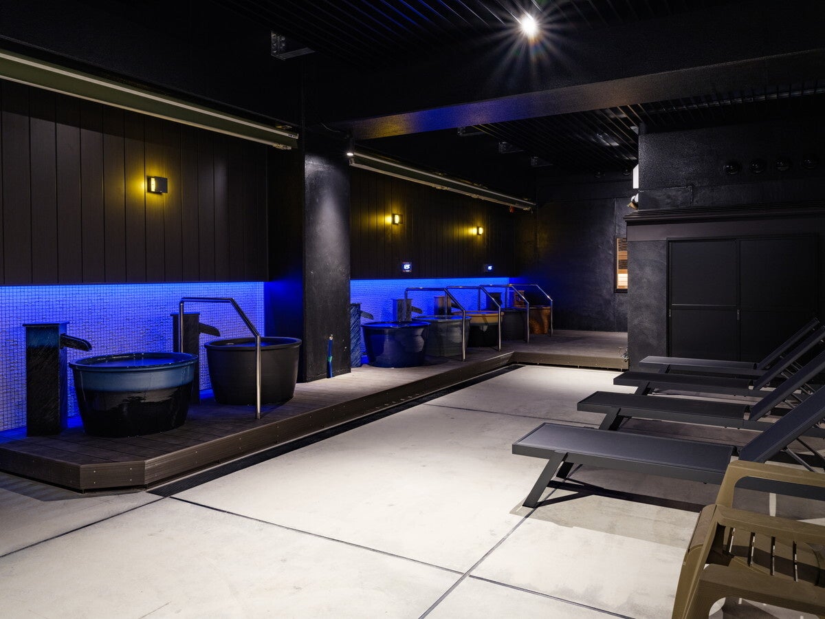 2階に新たに誕生するSauna「頂(Itadaki)」は、「高品質なサウナ室」、「天然地下水の水風呂」、「充実の外気浴/内気浴スペース」を三位一体で備え、お客様がサウナ体験に集中して、心身共に整うことができる環境を提供する。メインのオートロウリュサウナ室は、しっかりとした湿度があるため体が温まりやすく、さらに男性側にはオートロウリュ時に天井に設置したブロアファンから自動的に風が吹き出すオートアウフグース機能も付随しており※、熱波を楽しむことができる。また、個室型のセルフロウリュサウナ室も設置しており(男性4室、女性1室)、自分のペースでサウナを楽しむこともできる。水風呂には色とりどりな信楽焼の1人用陶器風呂を用いており(男性5台、女性2台)、立山連峰からの恵みである天然地下水を独り占めすることができる。また、男性サウナには富山市内最大規模の外気浴及び内気浴スペースを完備している。サウナ後に客室において良質な睡眠が得られるよう、湯船・水風呂まわりの間接照明にはセロトニンの分泌効果が期待できるリラクシング・ブルーライトを設置し、サウナ全体においても落ち着いたデザインと照明計画を心掛け、心身共にリラックスできる空間としている。なお、サウナは宿泊プランだけでなく、日帰りサウナプランA(客室利用付プラン)・B(サウナ・レストスペースのみ利用可能なプラン)においても利用できる。混雑時の対応として、宿泊プラン優先の洗面台ブースを設けている。