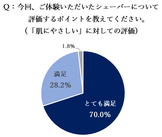 現在ご自身で使用されているシェーバーと比較した際、99.1%と多くの方が「いつもより深く剃れる」ことに満足していると回答。加えて、肌あたりについてのアンケートでは「肌あたりが良い」と回答した方、「肌にやさしい」ことに満足していると回答した方の割合は共に98.2%と高い評価を得ました。