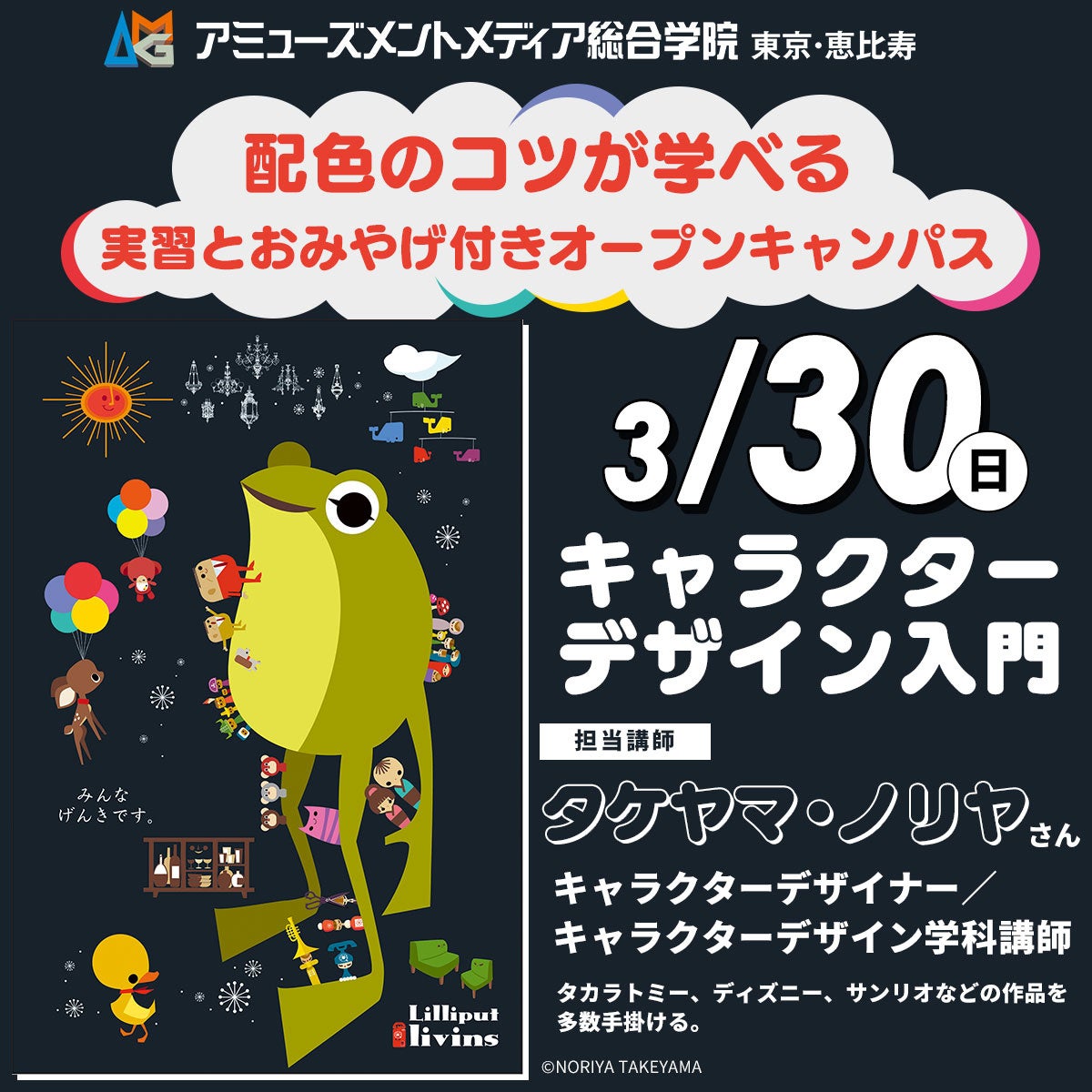 現役キャラクターデザイナーで学院講師のタケヤマ・ノリヤさんが、授業で教えている内容をそのまま体験できるワークショップを、3/30(日)のオープンキャンパスにて開催いたします。