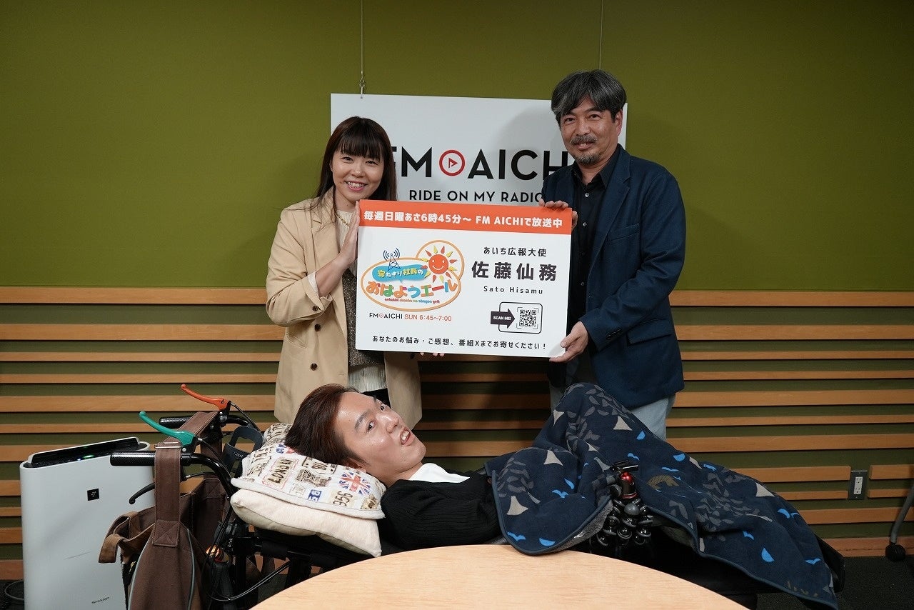 「寝たきり社長のおはようエール」は、「寝たきり社長」こと株式会社仙拓の佐藤仙務社長と、アシスタントのFM AICHIパーソナリティ、吉川朋江がお送りしている15分のラジオ番組。先天的に全身の筋肉が徐々に衰える「脊髄性筋萎縮症」という難病を抱えながらも、日々新しい挑戦を続ける佐藤社長が、日曜の朝からリスナーにエールを送る番組です。