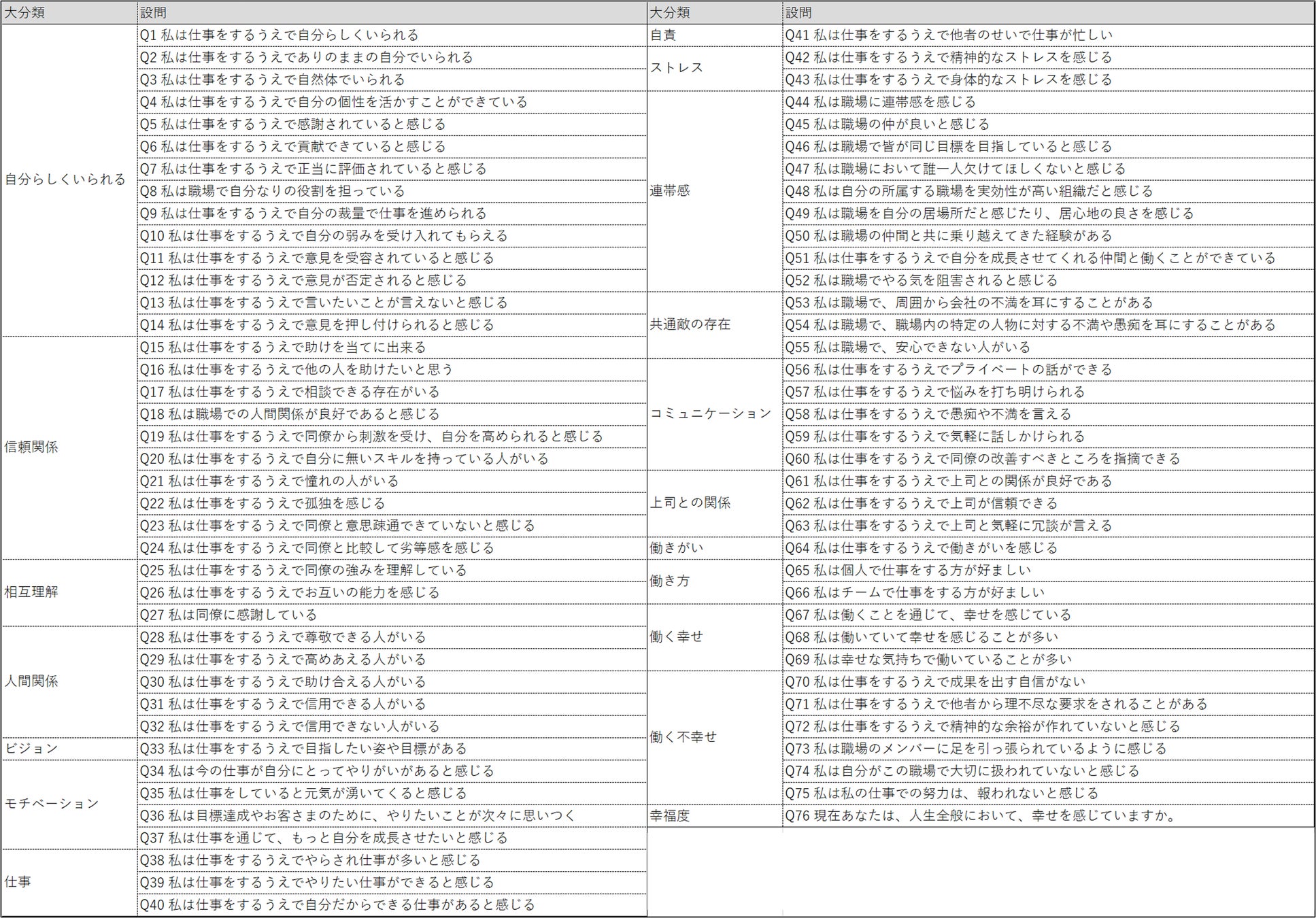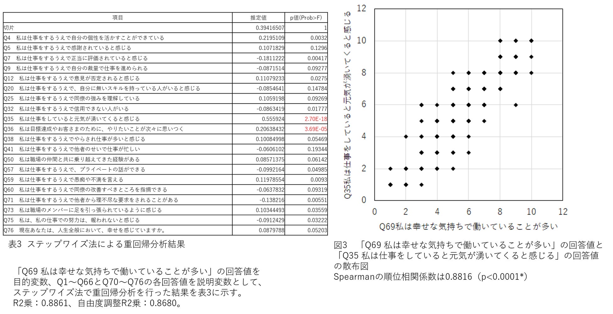 持続的幸福(Well-being)は、自分らしくいられる、信頼関係、相互理解、人間関係、モチベーション、仕事、自責、連帯感、コミュニケーション、働く不幸せ、幸福度の項目に関係が示された(表3)。