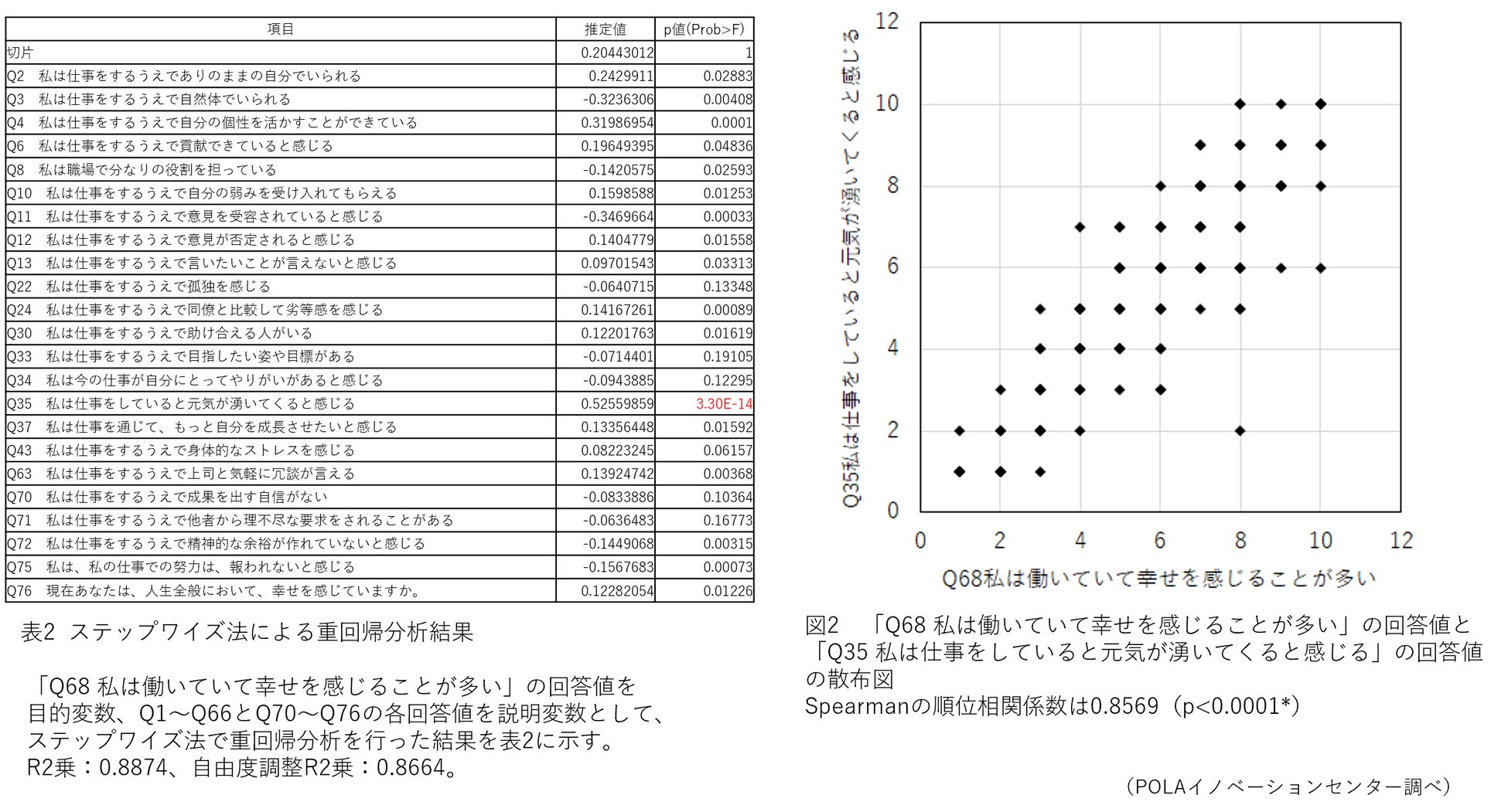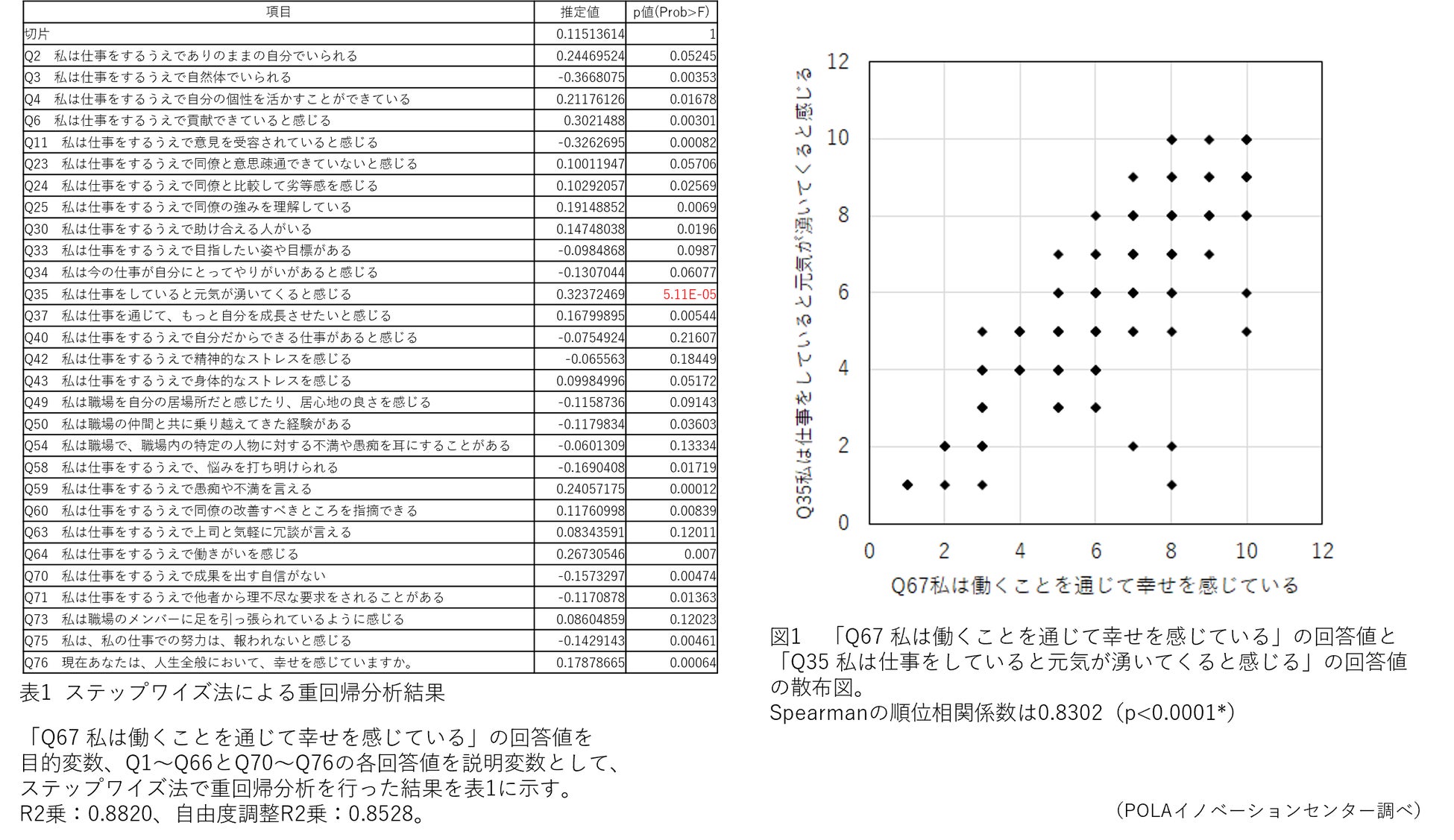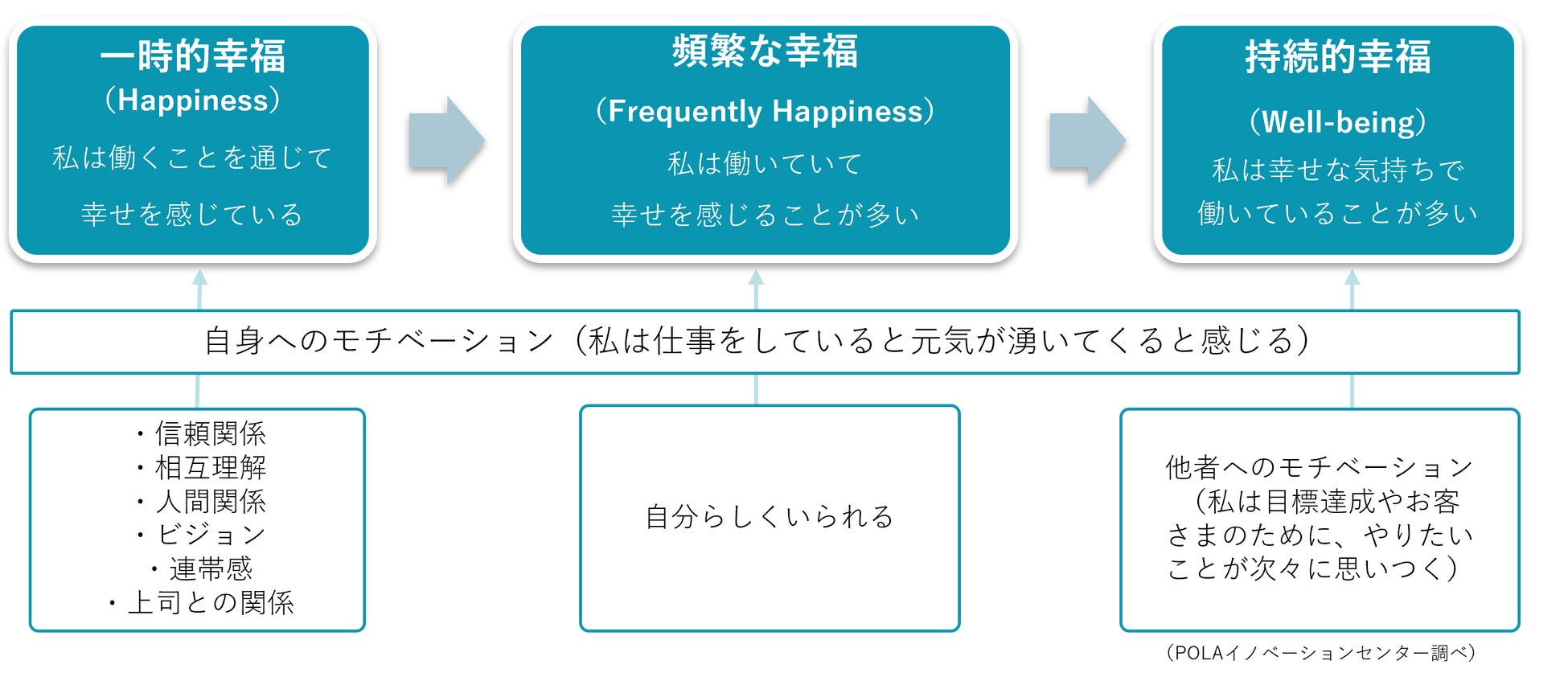 ※ポーラ従業員147名を対象としたアンケートにて、「信頼関係」「相互理解」「人間関係」「ビジョン」「モチベーション」「連帯感」「上司との関係」等の項目が、働きがいや働く幸せとどのように相関しているかを調査。