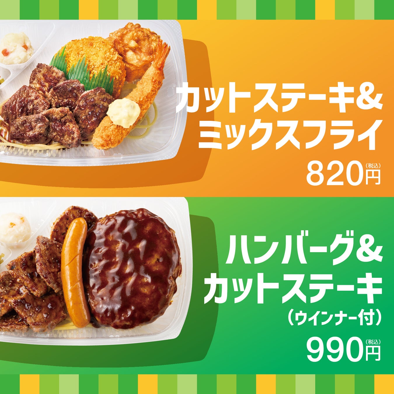 カットステーキ、から揚、メンチカツ、エビフライなど人気のおかずを詰め込んだ、ステーキと揚げ物を一緒に楽しめる『カットステーキ&ミックスフライ弁当』と、カットステーキとハンバーグの両方のお肉を味わうことが出来、さらにウインナーまで付いた『ハンバーグ&カットステーキ弁当(ウインナー付)』を新発売いたします。