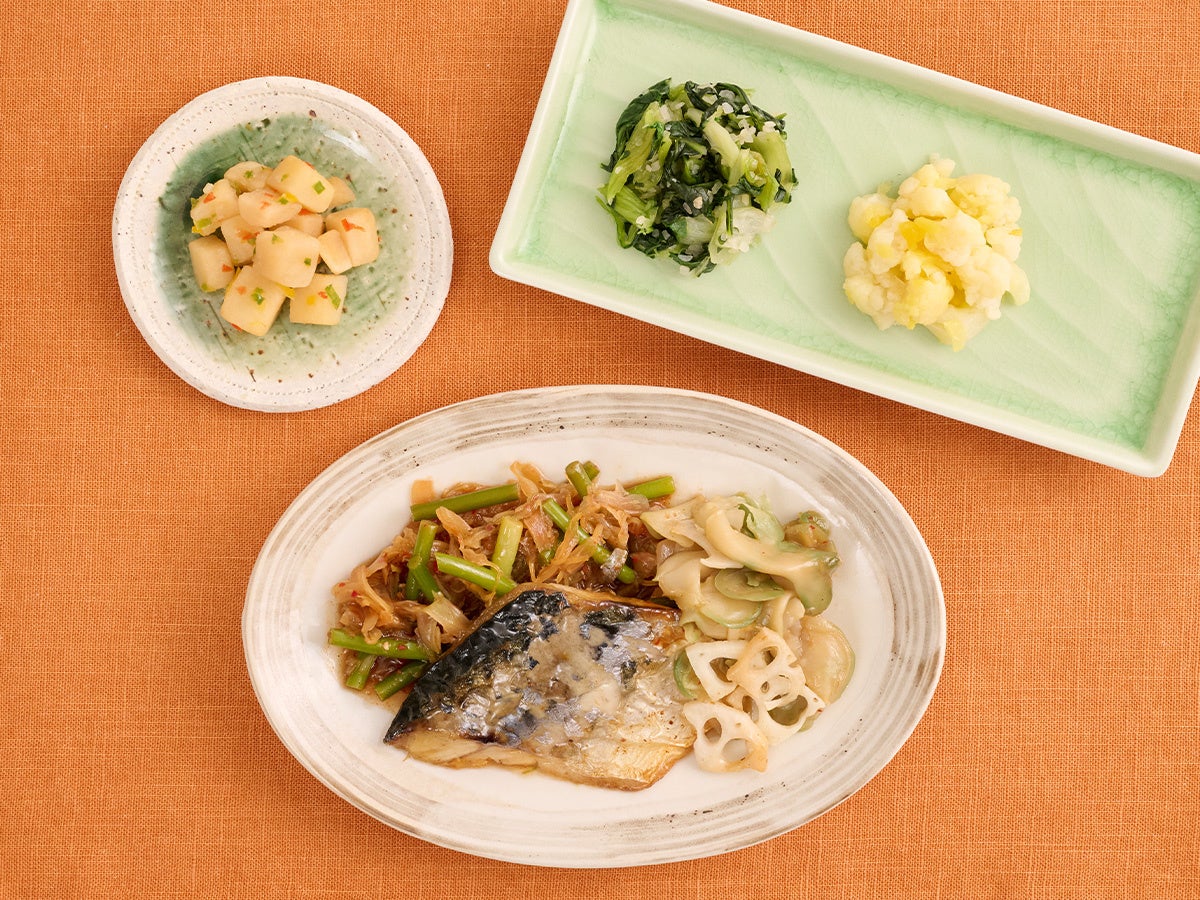 副菜は、素材の味を活かしたまろやかな味わいのジャガイモの中華和え、玉ねぎの風味がクセになる青梗菜の塩だれ、たくあん入りでカラフルに仕上げたカリフラワーのさっぱり和えです。 ピリ辛のメインと副菜がうまく調和するよう、全体の味のバランスを整えて仕上げています。