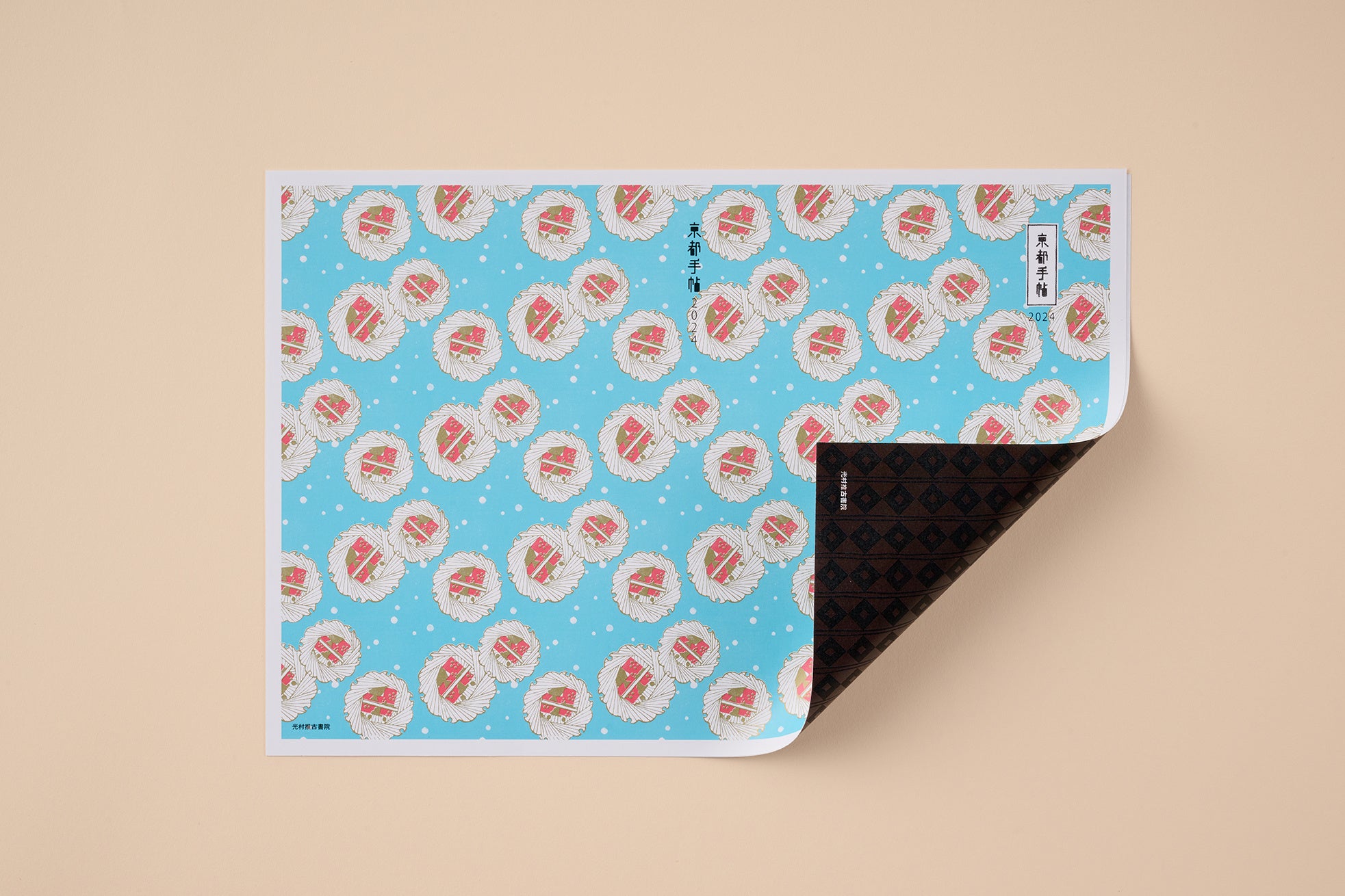 こちらが全国で販売する表紙。水色の表紙は竹笹堂の木版デザインで、「雪輪雛」。現代の「ひなまつり」のルーツともいわれる「流し雛」が吉祥文様の「雪輪」の中に配されています。リバーシブルで裏はシンプルなブラック系の表紙です(こちらは竹笹堂の表紙ではありません)。