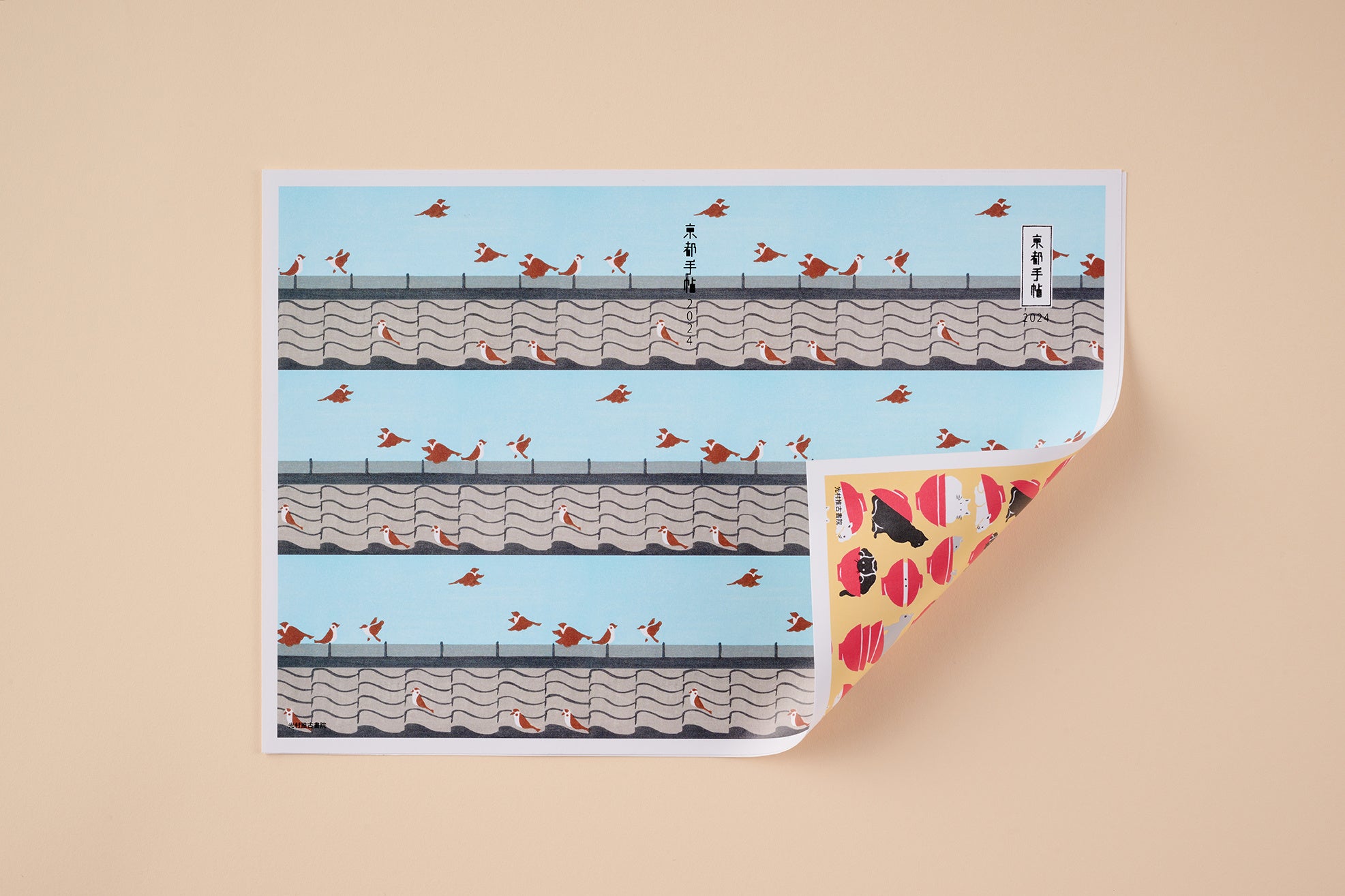 こちらが京都府下の販売店でのみ販売する表紙。町家にすずめが集う「秋晴れ」とお椀に入った猫が愛らしい「わんこねこ」のリバーシブル。どちらも竹笹堂による木版デザインです。