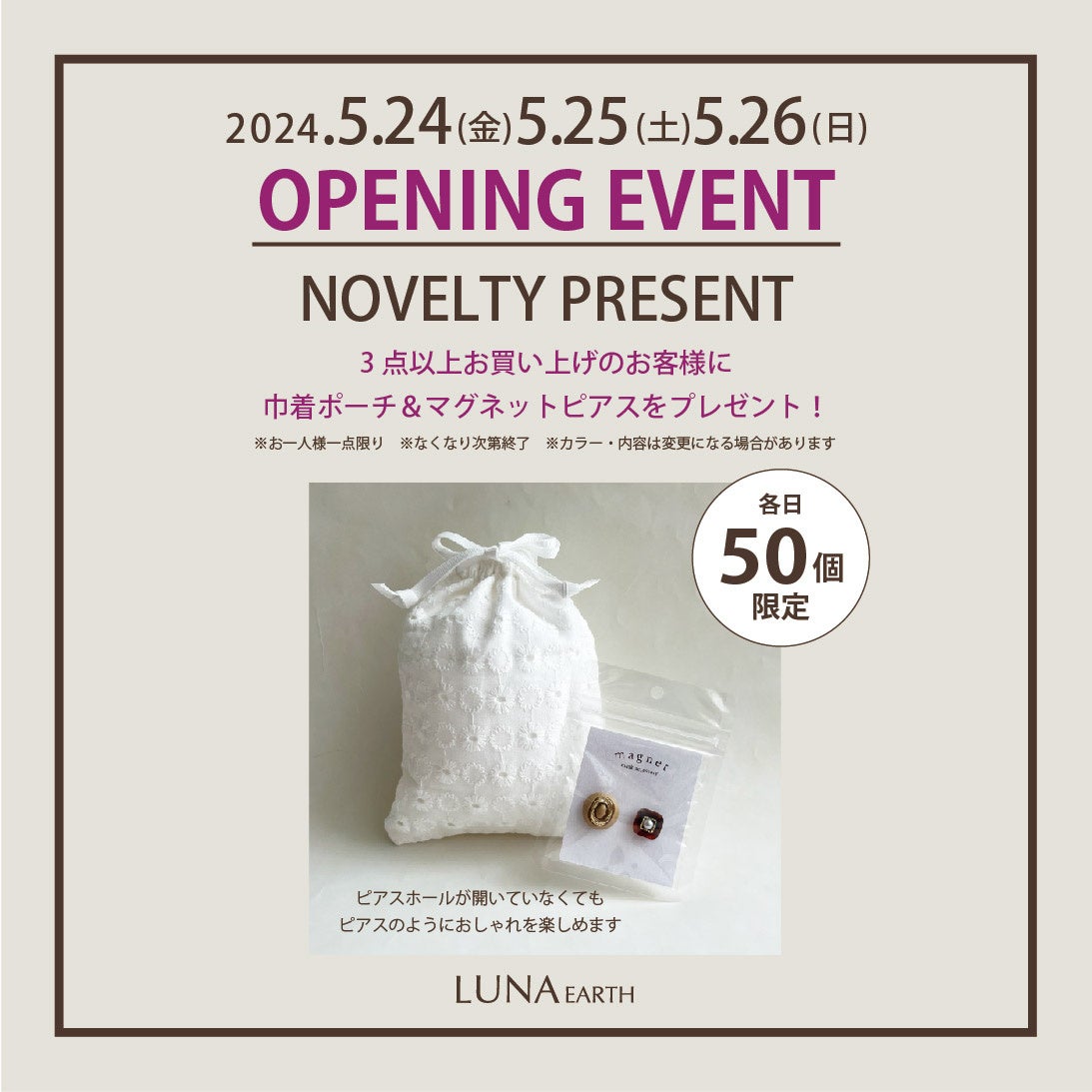 商品を3点以上お買い上げのお客様に、巾着ポーチ&マグネットピアスのセットをプレゼントいたします。