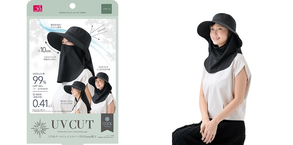接触冷感生地を使用したひんやりと心地よい肌触りのUV帽子。3wayスタイルでシーンに合わせて使い分けができ、顔周りを日差しから強力にガードします 。口元はメッシュ仕様で呼吸がしやすく、取り外し可能なストラップも付属 。UVカット率99%以上(SPF50+)の高い遮蔽率を誇り、機能性と快適さを兼ね備えた夏の必須アイテムです 。
