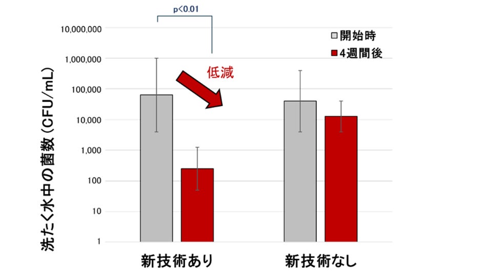 次に、洗たく水内の菌数への影響を確認するため、新技術ありと技術なし*3の衣料用洗剤それぞれを5家庭で、2023年1月に4週間使用してもらいました。使用開始直前と4週間後の洗たく水を回収して菌数を調べた結果、技術なしの場合は菌数に変化が見られない一方、新技術では開始時と比べて4週間後の洗たく水中の菌数が減少しました(図3)。これは、新技術による洗たく槽のバイオフィルム内の菌の除菌効果*1と推察されます。