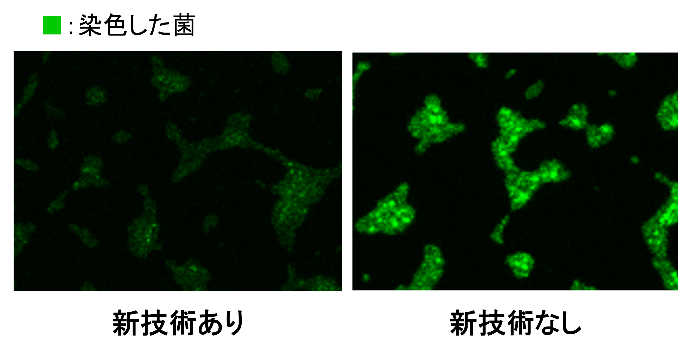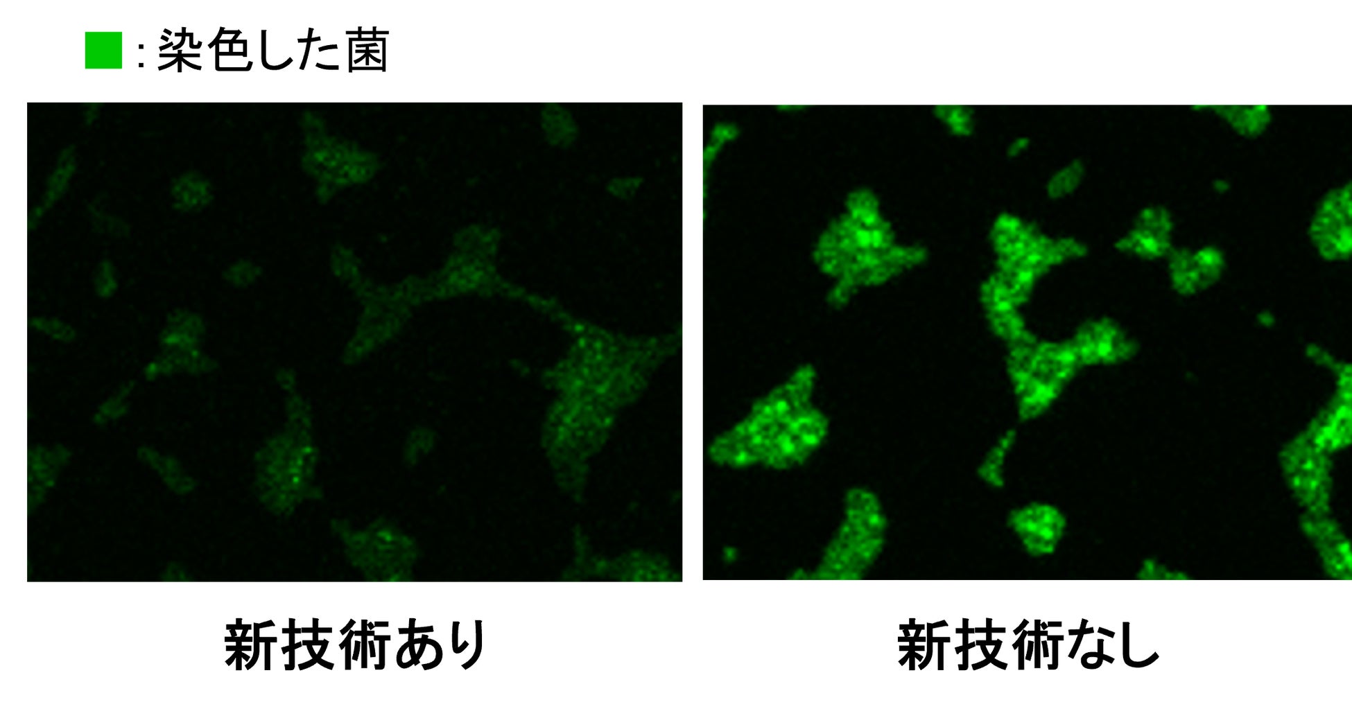 花王は、バイオフィルム内の菌に対する効果を検証するため、陽イオン界面活性剤とバイオIOSを組み合わせた新技術ありおよび技術なし*3の衣料用洗剤を作成。実際の洗たくと同じ条件で、バイオフィルムを形成させた洗たく槽板を模したモデル基板を洗浄しました。その後、共焦点レーザー顕微鏡を用いてモデル基板上のバイオフィルム内の菌を観察すると、新技術ありの場合では菌はほぼ見られず(図2)、菌数は浸漬前より99%減少しました。この結果より、従来困難とされてきたバイオフィルム内の菌に対しても除菌効果*1を発揮することを確認しました。
