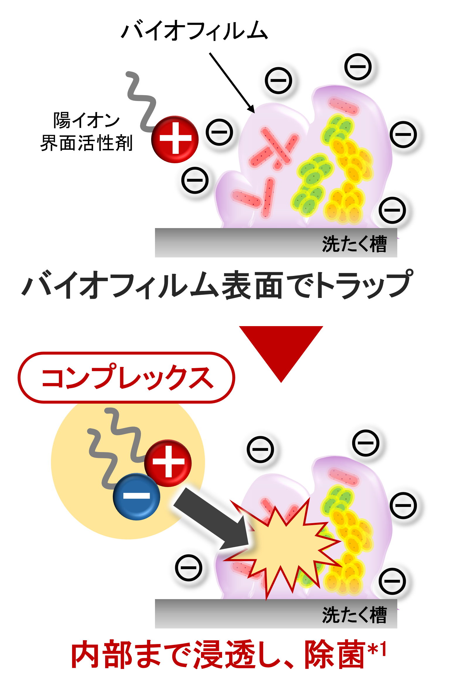 そこで、等温滴定熱測定分析を用いて2種の界面活性剤間の相互作用を解析し、除菌効果が消失するメカニズムを探索。最適なコンプレックス状態を形成する界面活性剤の組み合わせについて検討を重ねました。その結果、独自開発の陰イオン界面活性剤「バイオIOS」と組み合わせることで、陽イオン界面活性剤が除菌効果*1を維持したままバイオフィルム内部まで到達することを見いだしました(図1)。