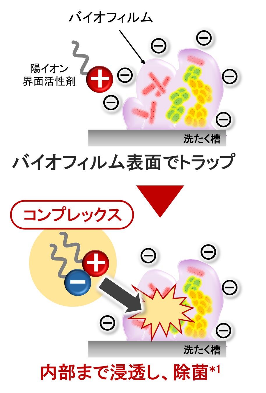 衣料用洗剤に使われる洗浄成分のうち、特定の陽イオン界面活性剤には除菌効果がありますが、洗たく槽のバイオフィルム内の菌には効果を発揮しないことが知られています。その要因として花王は、バイオフィルムの表面が負に帯電しているため、陽イオン界面活性剤がそこにトラップされている可能性に着目しました。しかし、陽イオン界面活性剤の電荷を中和させるため陰イオン界面活性剤を組み合わせると、互いの働きを打ち消してしまい、除菌効果は消失するというのがこれまでの通説でした。