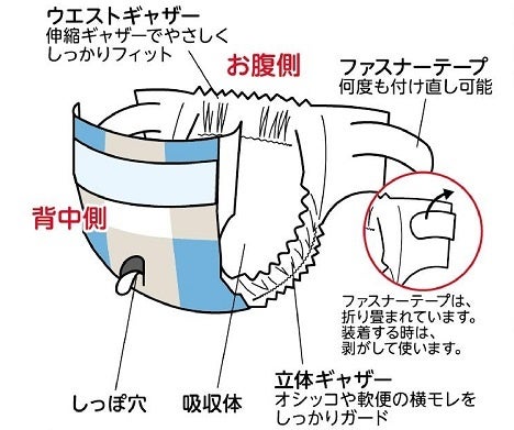 ・ウエストの伸縮ギャザーでやさしくしっかりフィット。ファスナーテープは何度も付け直しが可能です。