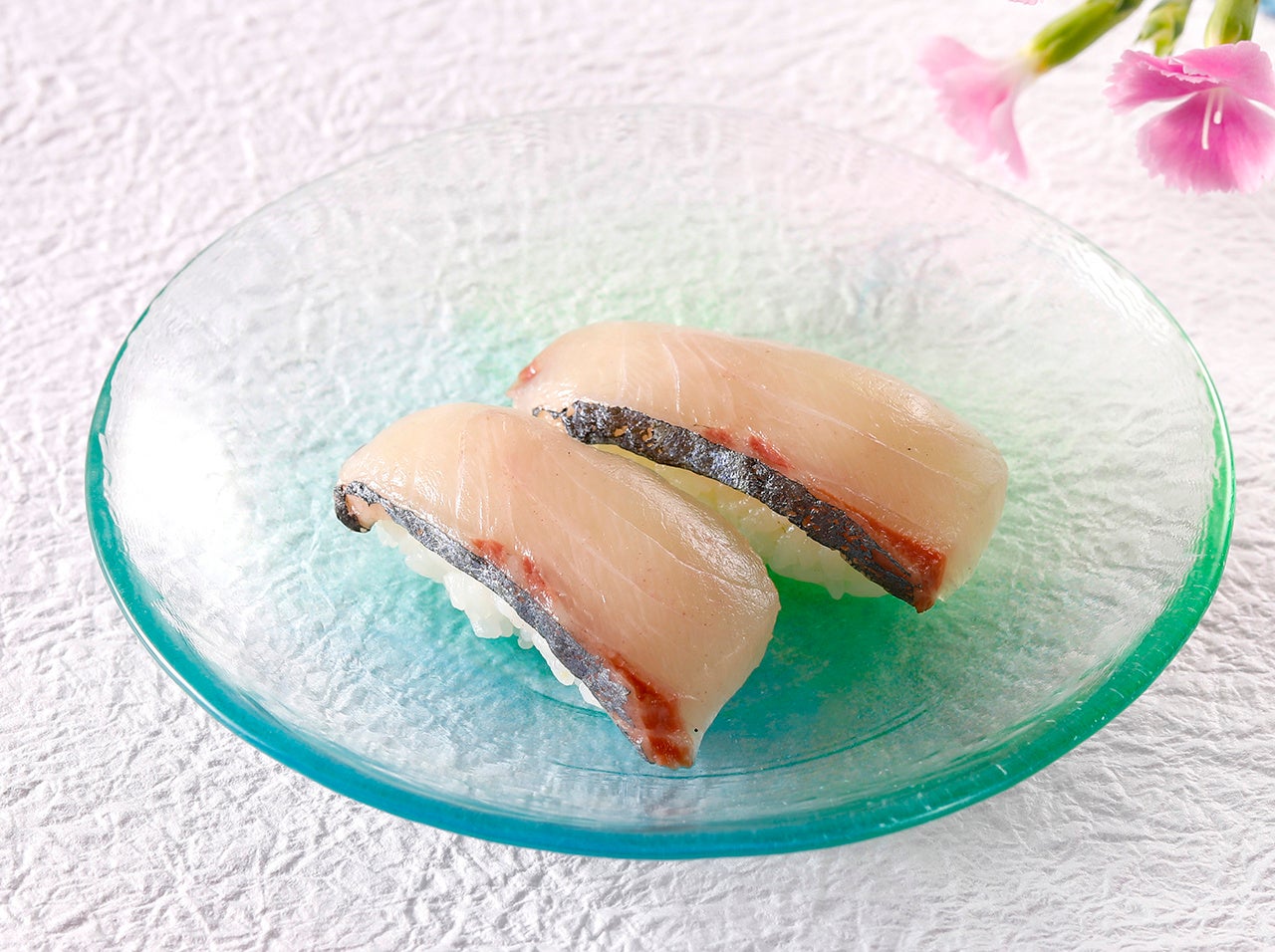 外見は青魚ですが、白身魚とアジの中間のような、両方の美味しい部分を兼ね備えている『縞鰺』。長次郎オリジナルの寿司醤油が素材の味わいを引き立たせます。