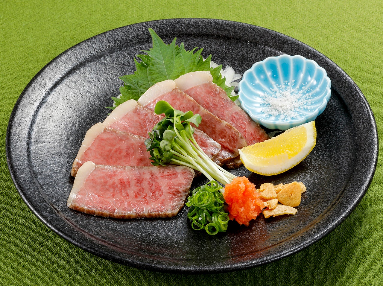 青森県は八戸市で生産されるブランド牛『毬姫牛』はきめ細かい肉質と低い融点が特徴です。さっと炙った『毬姫牛』には刻みわさび、ねぎ塩、ガーリックを添えて、舌ざわりのなめらかな甘みとくせのない上質な味わいをご堪能ください。