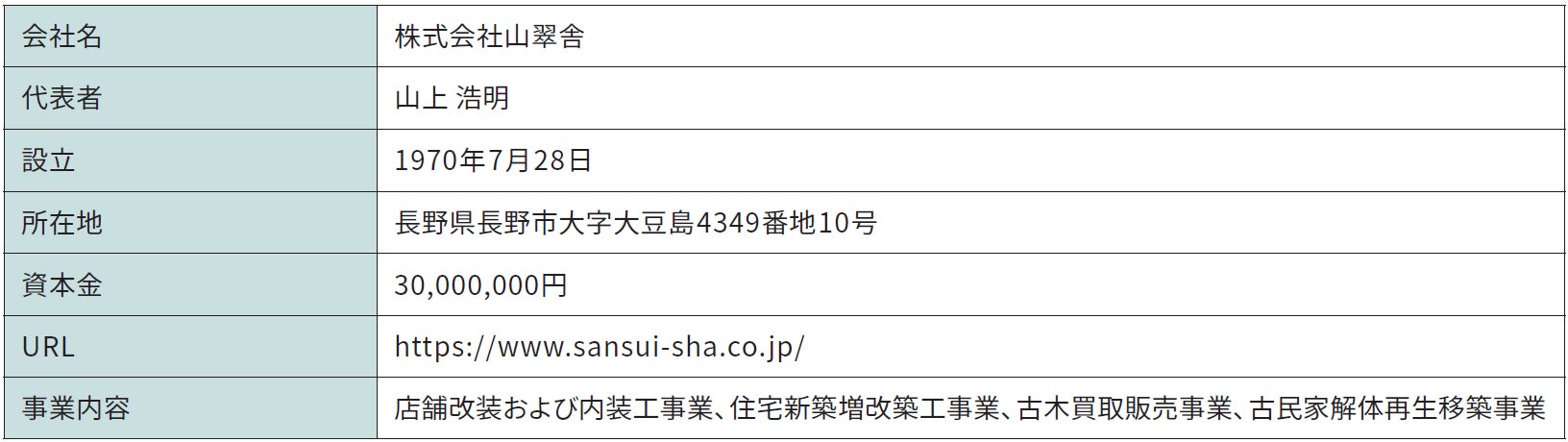 1930年に長野県長野市で創業した山翠舎(さんすいしゃ)は、古民家の解体時に得られる質の高い古材「古木」を活用した店舗の設計施工を軸に、古民家の移築再生やインテリア家具の製造販売を行う『SANSUI』ブランドでの海外進出など、多彩なビジネス展開で注目を集めている企業です。