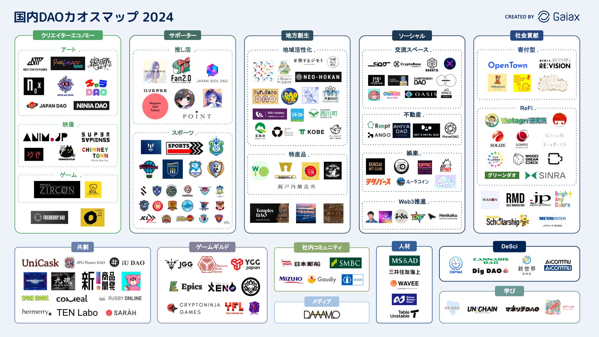 自律分散型組織「DAO」のコンサルティング・実務支援を提供する株式会社ガイアックス(本社:東京都千代田区、代表執行役社長:上田 祐司、証券コード:3775、以下 ガイアックス)は、4月22日に解禁された合同会社型DAOを含めた204件掲載の「国内DAOカオスマップ2024」( https://daox.solutions/dao-chaosmap/ )を公開します。