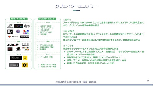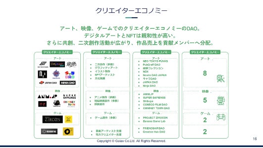 「クリエイターエコノミー」「ゲームギルド」の分野では、数万人規模のDAOが存在し、他分野と比較し多い傾向にある。特に日本文化の拡大をミッションとしたDAOなどは海外からの参加者も多い。