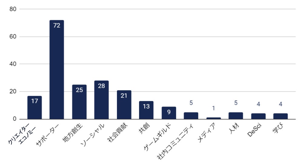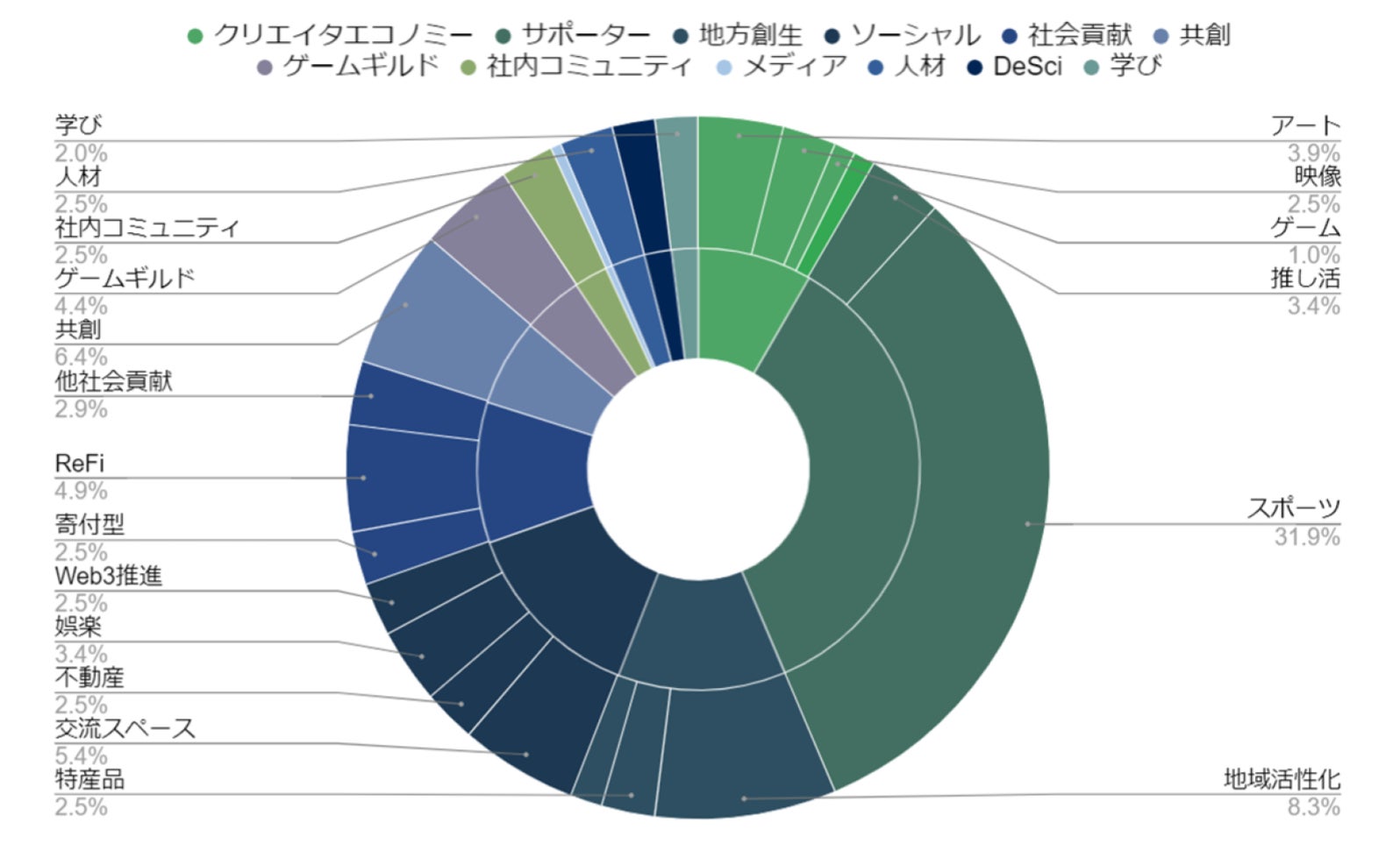 地域密着系のスポーツチームの他、「地方創生」、地方創生につながる「ソーシャル」(空き家など不動案)、「社会貢献」(地域の環境保全)などを加えると、地域密着系DAOが約半数を占める結果に。