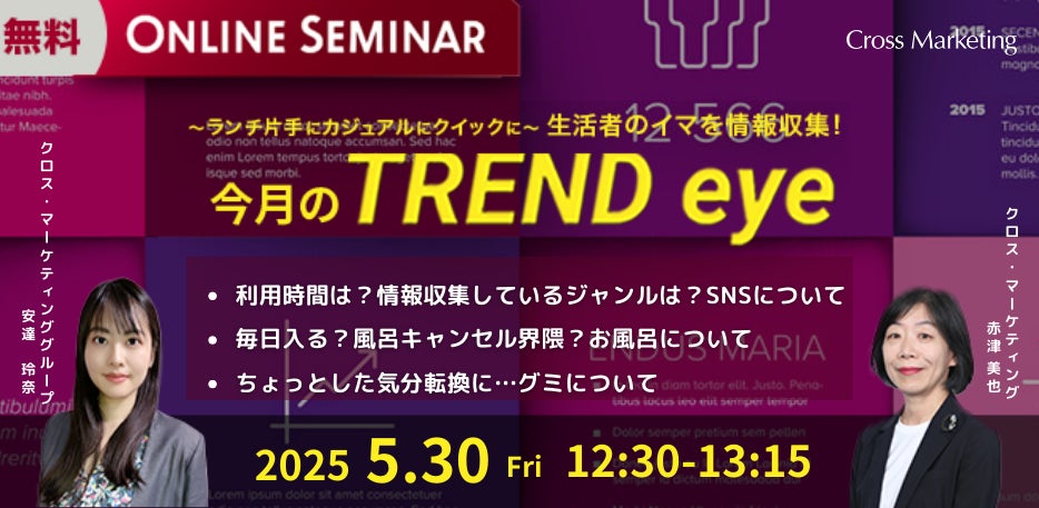 株式会社クロス・マーケティング(本社:東京都新宿区 代表取締役社長兼CEO:五十嵐 幹、以下当社)は、5月30日(金)にセミナーを開催いたします。