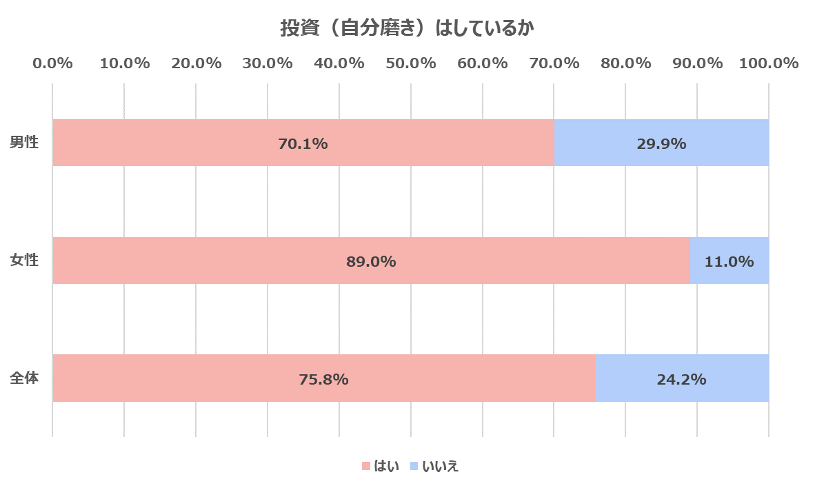 75%以上の方が投資(自分磨き)をされているようです。また女性は9割近くの方が投資(自分磨き)をしていると回答しました。