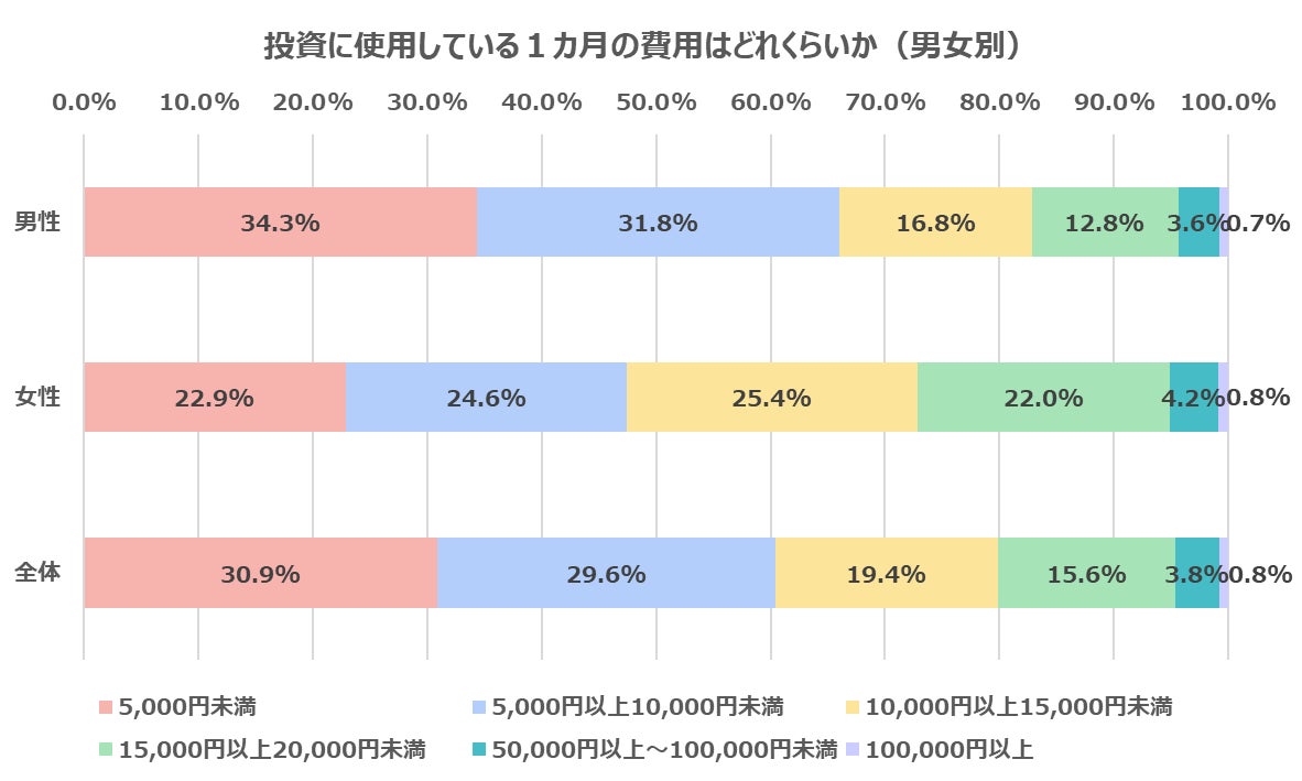 先ほどのグラフでもわかる通り、女性の方が様々な投資を行っていることからも、10,000円以上かけている方が52.5%、かたや男性は10,000円以上の方は33.9%となっており男女にも大きな差があることが分かります。