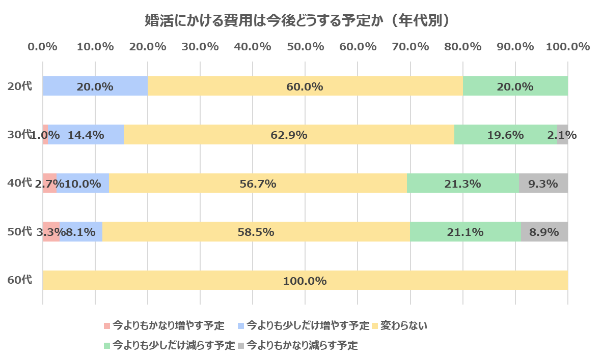 年代別に表したものが以下のグラフです。若い世代ほど婚活にかける費用は今後増やす予定の方が多い結果となりました。