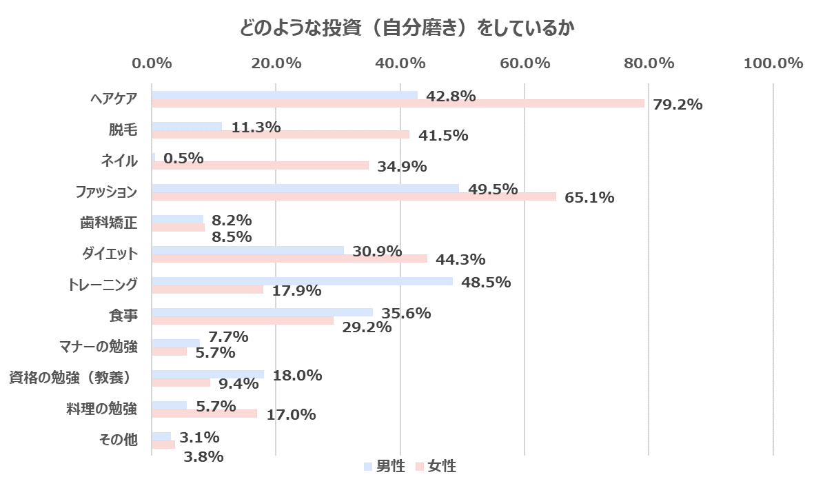 各項目において女性の方が男性を上回っていますが、トレーニング、食事、マナーの勉強、資格の勉強(教養)は男性の方が多い結果となりました。