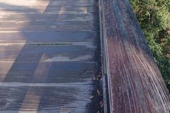 屋外にて風雨に晒されながら見学者を迎えている現状では頻繁な定期管理を欠かすことができず、そのための費用は膨大なものです。現在、橋梁全面に塗布された防腐剤が劣化し、コケ等の発生が確認されています。また、人が歩くことによって敷板と敷板の間に土が運ばれてしまい、堆積した土に雑草が生えてしまったことによる敷板の劣化も確認されています。
