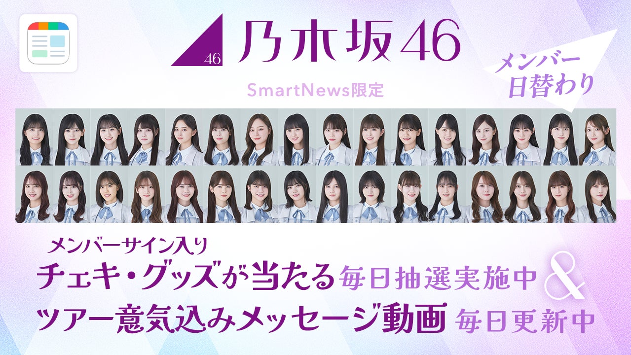 毎日登場メンバーが変わる特別な抽選企画や、SmartNews限定の撮り下ろしメッセージ動画など、ツアーが開催される約1ヵ月半の期間中、毎日楽しめる特別企画をご用意し、乃木坂46とファンの皆様の夏をSmartNewsが盛り上げます。