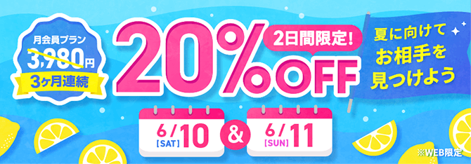 アフターコロナを迎えて早1ヶ月ですが、夏に向けて婚活市場は盛り上がりを見せています。この好機に、人気の月会員プランがお得な料金で登録できるキャンペーンを実施します。