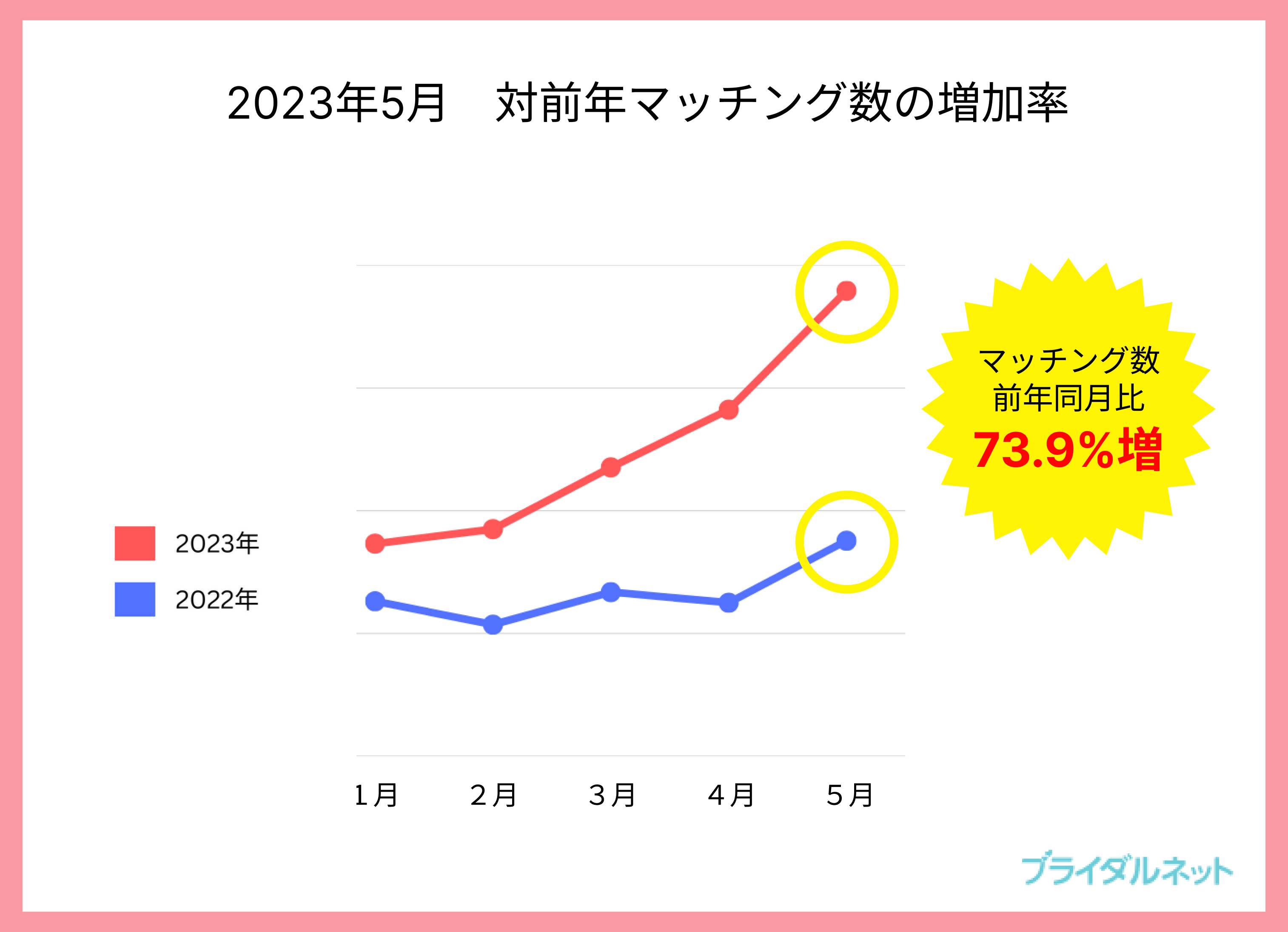 2023年に入り、新型コロナウイルスに対する政府の対応は“ウィズコロナからアフターコロナ”へと変化してきました。1月に新型コロナウイルスの感染症法の位置付けを「5類」へ引き下げる方針を表明し、イベントの収容人数制限を撤廃。3月はマスクの着用が任意になり、5月には「5類」へ移行など、月を追うごとに外出しやすくなり、マッチング後のデートに行きやすくなったことで、2023年以降マッチング数が急増。特に5月のマッチング数が顕著に伸びており、前年同月比で73.9%増となりました。環境要因により会員登録数・申込み数が増加したことに加え、「顔や容姿、雰囲気が知りたい」「人柄が知りたい」といった会員様のリアルな声を反映し、お相手からの申込み画面等サイトのリニューアルを続けてきたことがマッチング数増加に繋がりました。