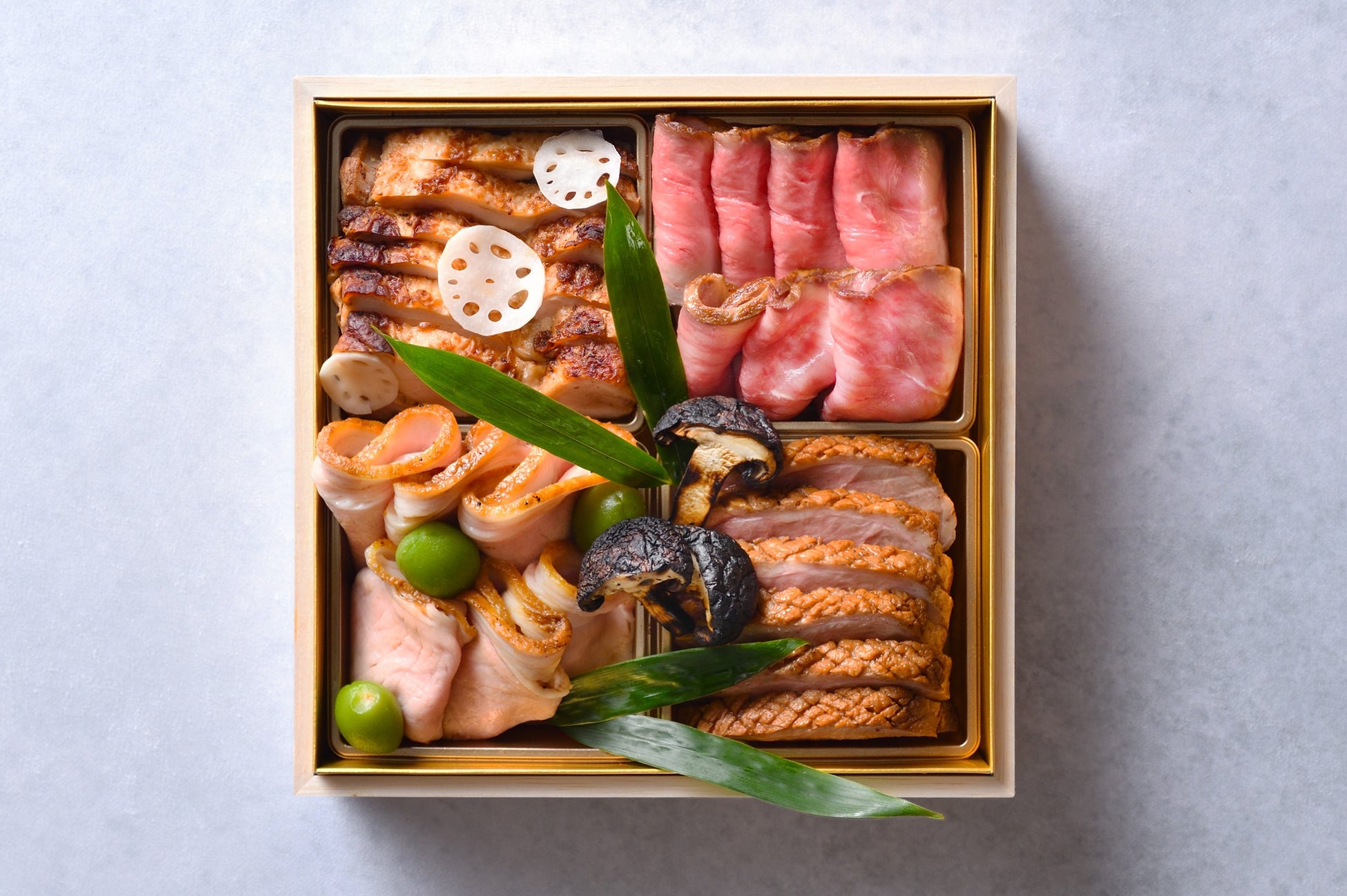 黒毛和牛八女玉露塩ローストビーフ/黒豚黒酢照り焼き/鹿児島県産軍鶏塩麴炙り焼き/北海道産鴨胸醬油麴スモーク/若桃甘露煮