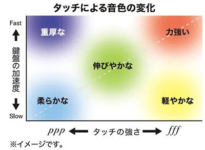 グランドピアノでは、繊細なタッチの違いに対して、ハンマーやダンパー、弦などの内部機構がその都度異なる動きをしながら相互に影響し合うことで、無限大の音色が生まれます。この多彩な音色変化を再現するシミュレーション技術が「グランド・エクスプレッション・モデリング」です。これにより、演奏者が思い描く細やかなニュアンスを忠実に再現する表現力を実現しました。指で鍵盤を押してから離すまでのタッチの強弱に加え、タッチのスピードや鍵盤を押すときの深さに応じた音色の変化も弾き分けられるため、さまざまな奏法に応じた音色表現ができ、本格的な演奏を楽しめます。