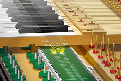 電子式「アーティキュレーション・センサーシステム」を新たに開発しました。88鍵すべての鍵盤の下に搭載されたセンサーのワイヤレスコミュニケーションにより、ピアノ本来のタッチ感を損なう事なく、自然な演奏が可能です。また、鍵盤の打鍵・離鍵の動きを常に正確に把握し、スタッカート演奏時など細やかな鍵盤の動きを、従来よりもさらに正確に検出することが可能になりました。