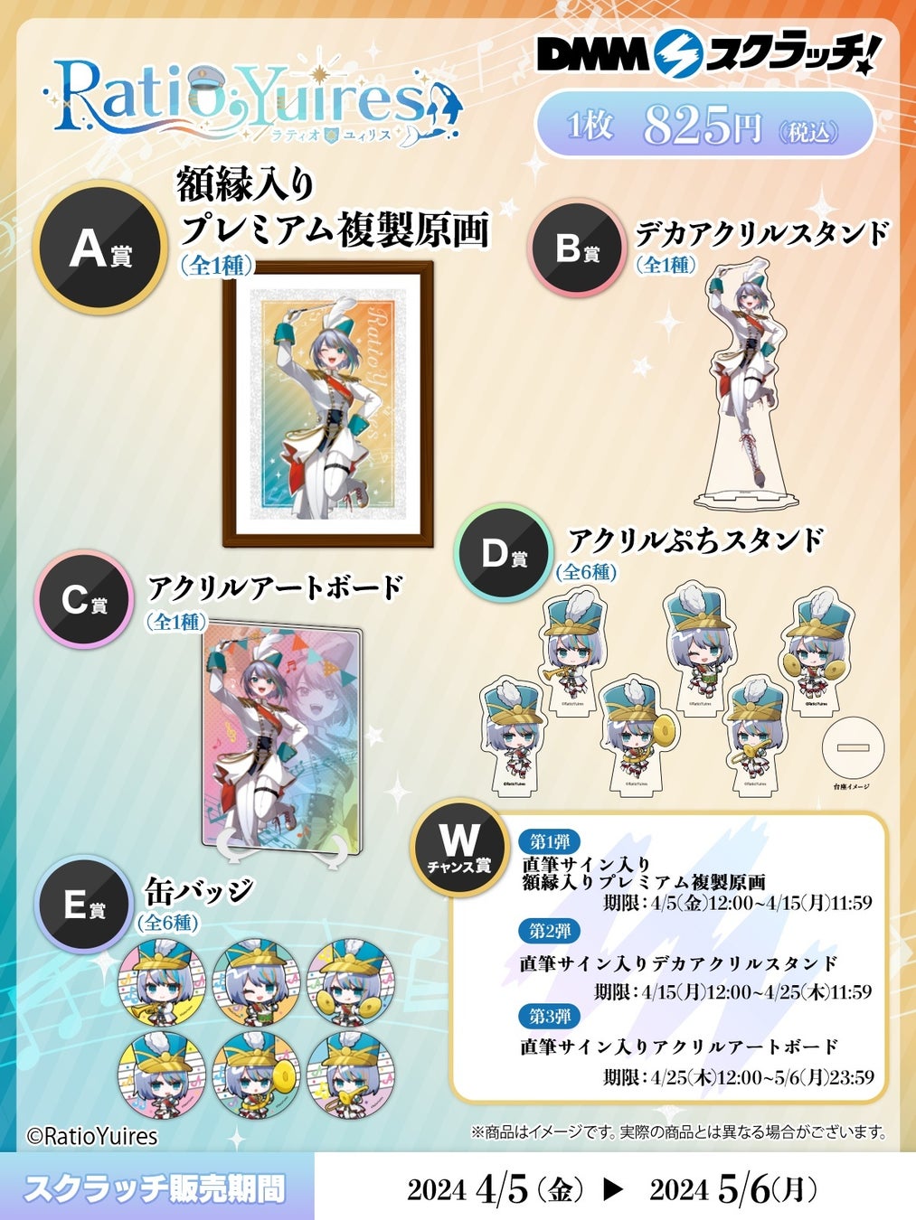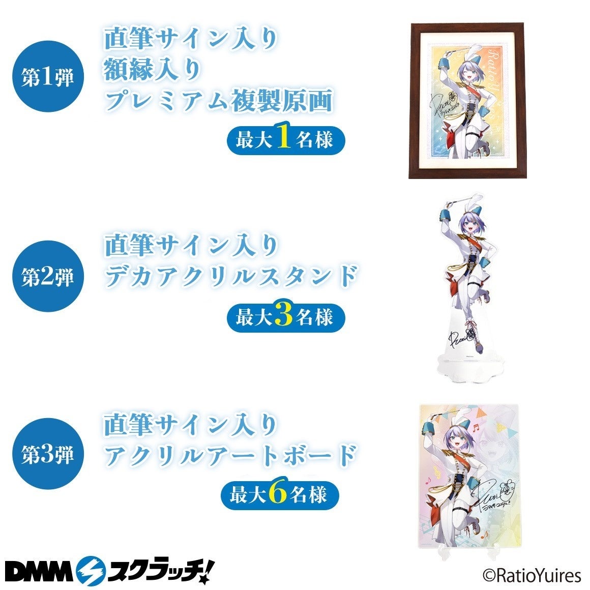 今回は、描き下ろし等身イラスト&描き起こしミニキャラを使用した新作グッズが豪華景品としてラインナップ。さらに、ラティオ・ユィリスさんの“直筆サイン入り”グッズが抽選で当たるWチャンス賞や、「DMMスクラッチ」発売記念のCM上映実施など、見どころ盛りだくさんです!