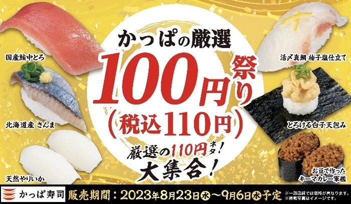 かっぱ寿司は、うまい寿司を手頃な価格で思う存分楽しんでいただきたいという思いで、一皿 100 円(税込 110 円)という価格と品質にこだわり、商品提供をしています。また、その取り組みを多くのお客様に知っていただきたいという思いから、定期的に「厳選100円(税込110円)祭り」を開催し、その時のおすすめネタをご用意しております。