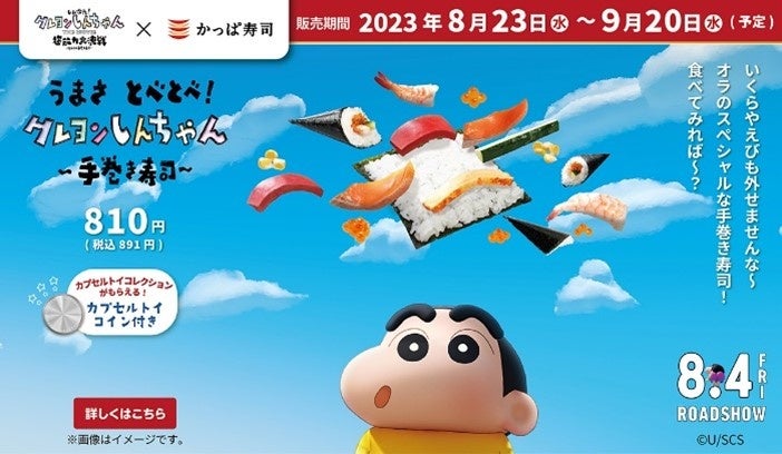 映画『しん次元!クレヨンしんちゃん』とコラボレーションした手巻き寿司「うまさ とべとべ!クレヨンしんちゃん ~手巻き寿司~」を、かっぱ寿司全店にて販売中です。
