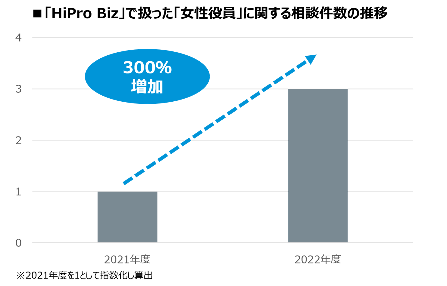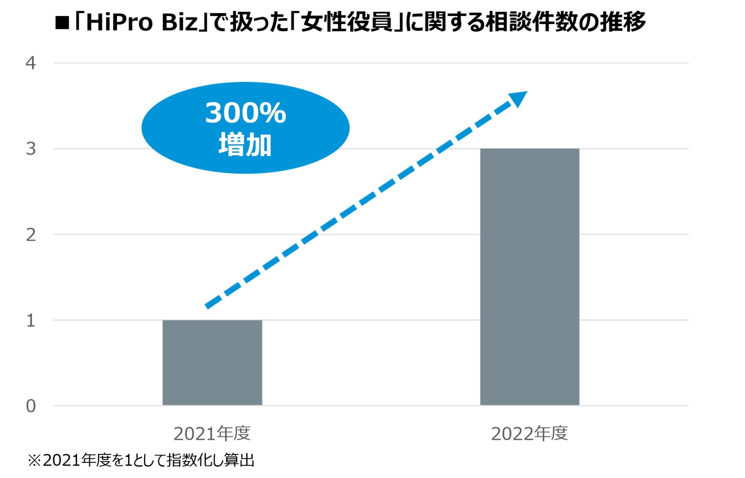 「HiPro Biz」では、企業からの「女性役員」に関する相談が急増。2022年度(2022年4月~2023年3月)の相談件数は、前年度比で300%にまで伸長しています。