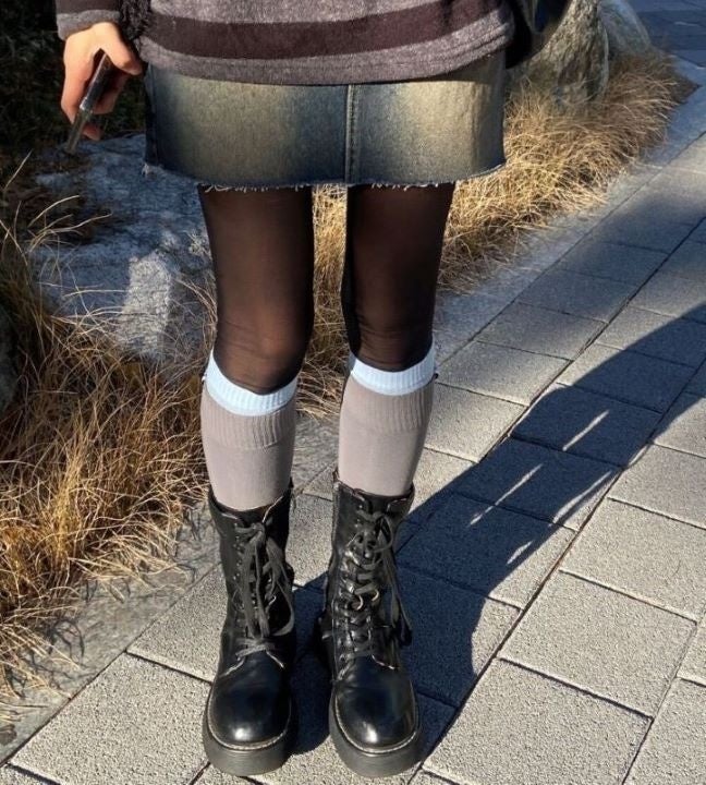 ブルーとグレーのトレンドライクな配色のレイヤード風靴下。透け感のあるタイツに重ねて、レースアップブーツでおしゃれ度アップ。