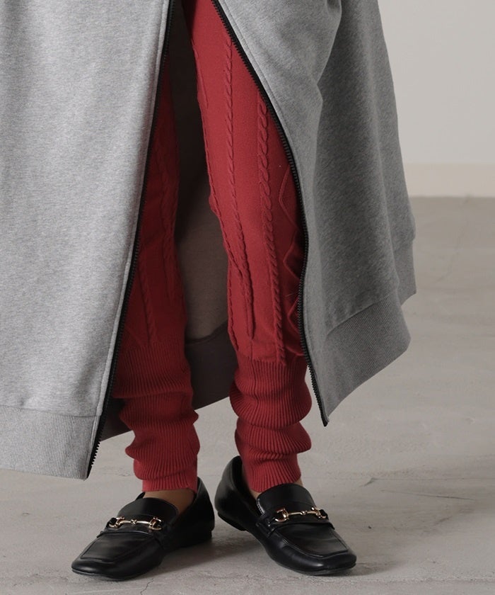 綿100%のリブ×ケーブル編みのコンビデザイン。レギンスは今季人気の赤を選び、ビットローファーとの旬顔コーデに。