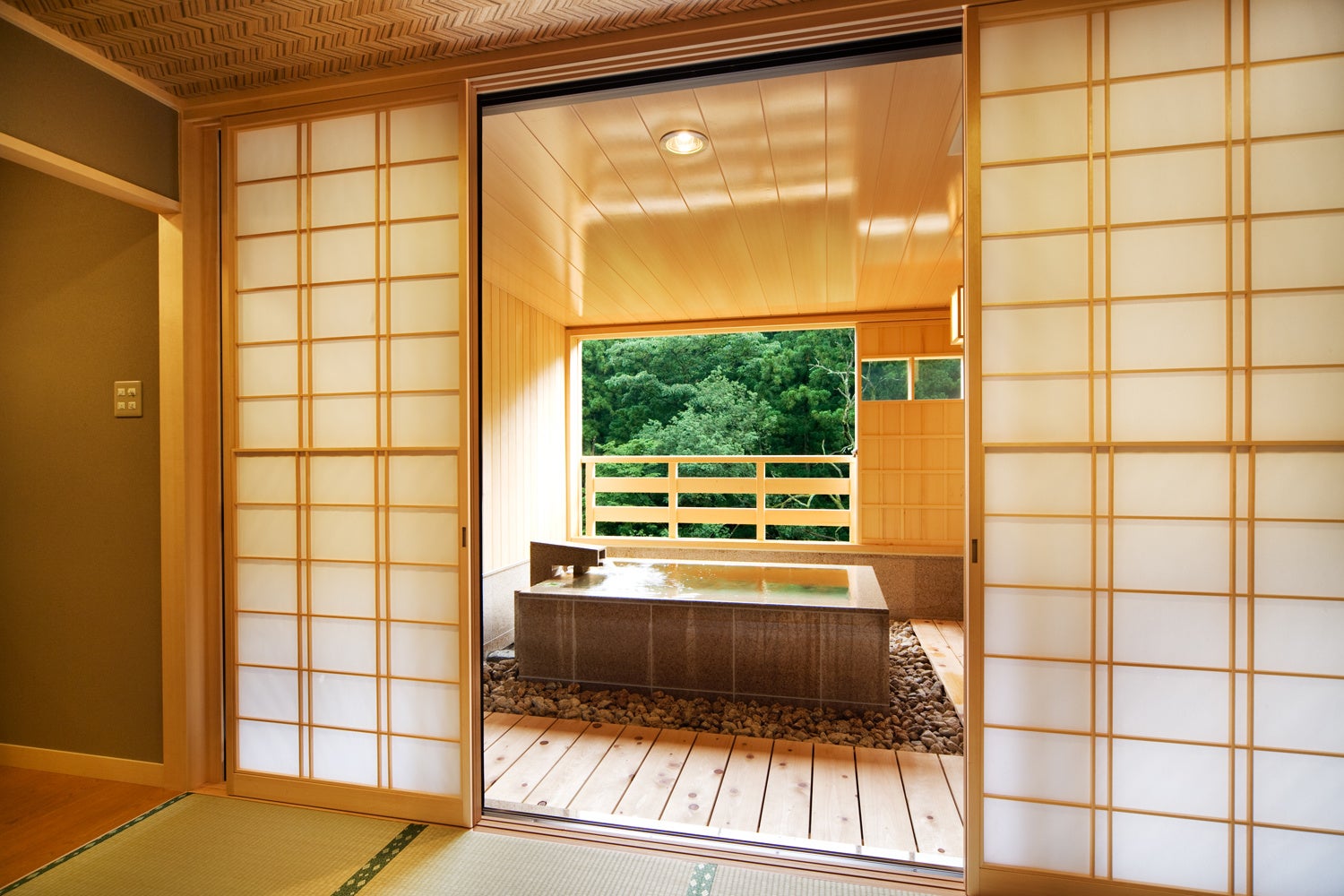 お部屋は露天風呂付き客室ほか、天然温泉の内湯とシモンズ社製ベッドが三世代に人気の和洋室など5タイプ48室をご用意。