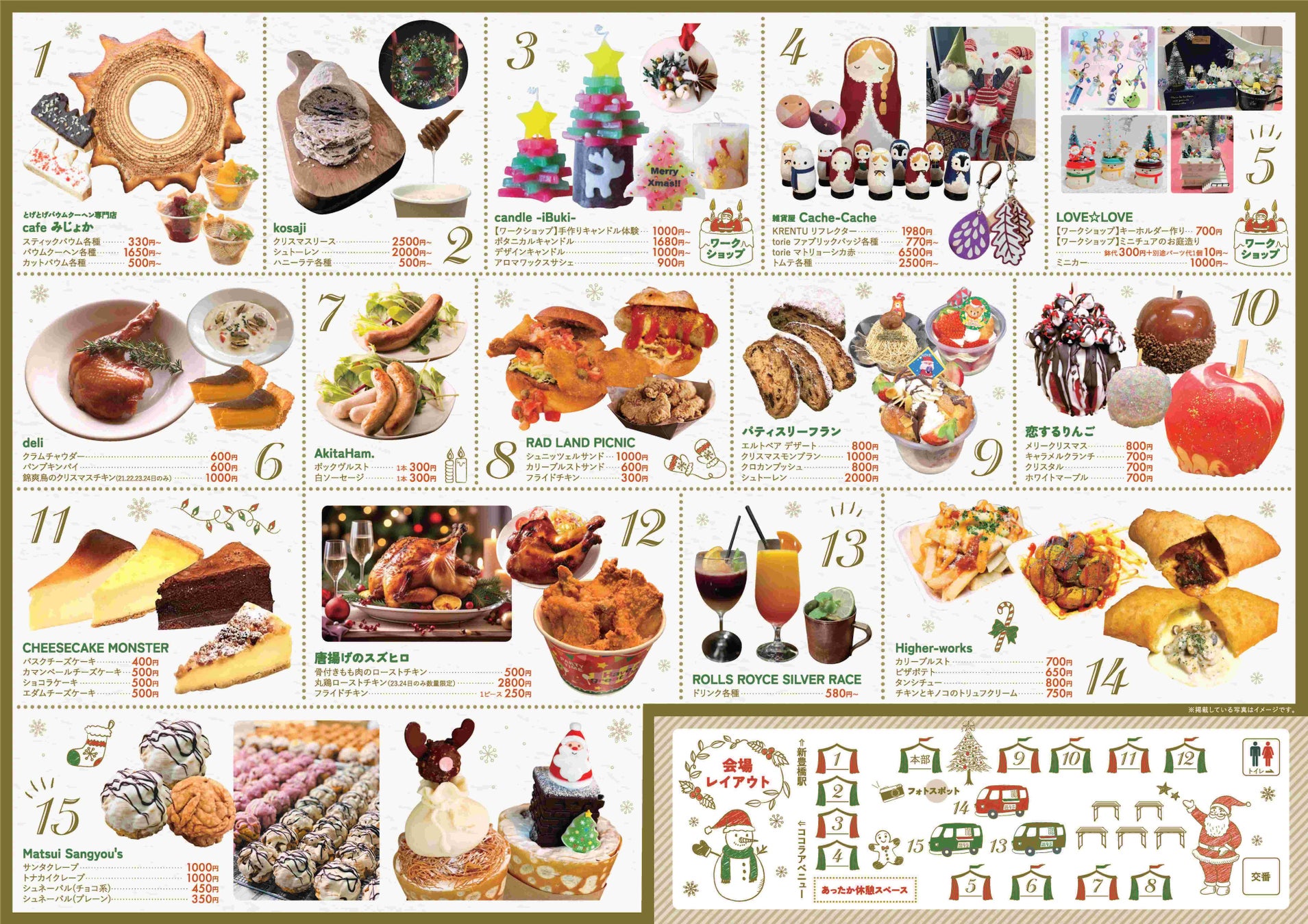 会場は豊橋駅南口駅前広場[豊橋鉄道渥美線 新豊橋駅前]です。イルミネーションが輝く中、ドイツの山小屋「ヒュッテ」風の屋台が並びます。15店舗の出店が予定されており、「シュトーレン」や「カリーブルスト(ソーセージ料理)」、「シュネーバル(揚げ菓子)」といったドイツ料理などが販売されます。