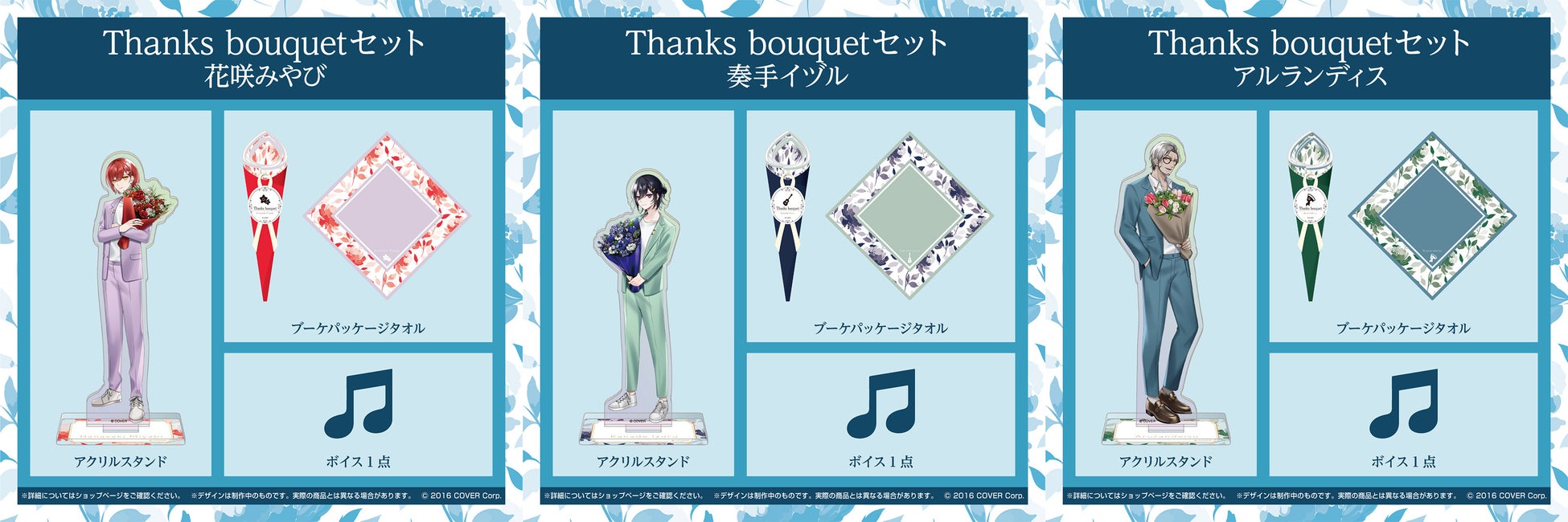 「Thanks bouquetセット」は「梅之シイ」先生描き下ろしのイラストを使用したオーロラ仕様のアクリルスタンドと、花束を模したブーケパッケージタオル、そして「ホロスターズ」の各メンバーが"あなた"とお家で過ごすホワイトデーの1日をテーマにしたシチュエーションボイスの3点がセットとなっています。