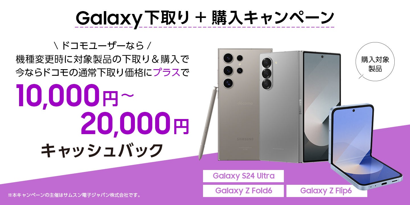 ドコモの対象製品を下取りし、ドコモで「Galaxy Z Fold6」「Galaxy Z Flip6」「Galaxy S24 Ultra」を購入いただいた方には、通常下取り価格に加えて1万円~2万円(不課税)キャッシュバックする「下取り+購入キャンペーン」を2024年7月31日~9月30日まで実施いたします。