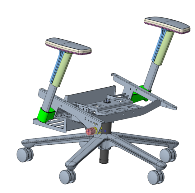 トヨタ紡織が開発した自動車用シートの快適性や機能性を損なうことなく、キャスターによる移動性や脚部、ひじ掛けの高さ調整といったオフィスチェアとしての機能を両立するため、これらの部位を含む構造全体を複数のユニットに分解して設計。運転姿勢とは異なるオフィスチェアとしての着座姿勢に対応するため、座面の高さや角度の最適化を行いました。着座時の荷重バランスや可動部の動作性を精緻に制御することで、安定性・安全性・操作性の向上を実現しました。