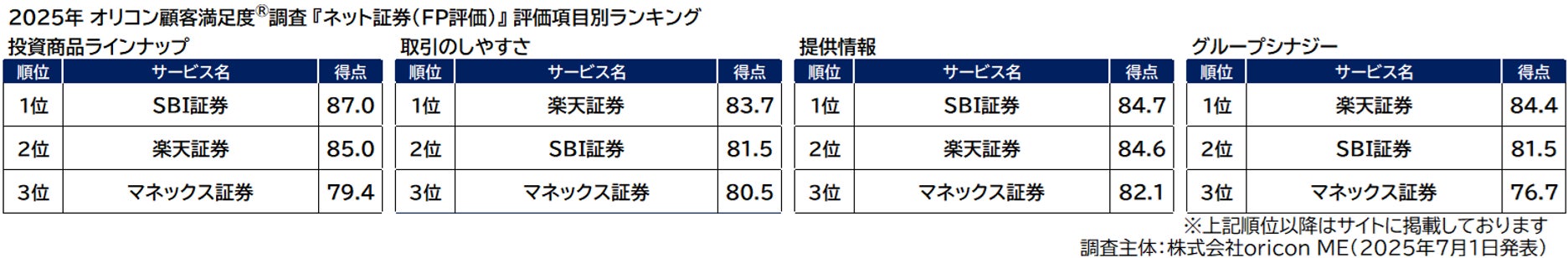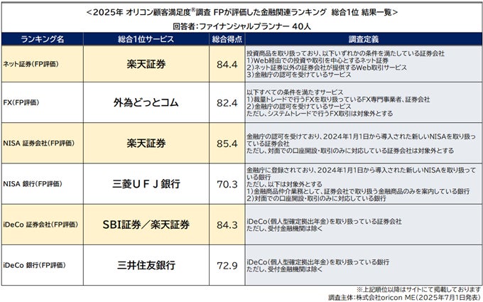 オリコン株式会社(本社:東京都港区 代表取締役社長:小池 恒 略称:オリコン)は、グループ会社である株式会社oricon MEが、FP(ファイナンシャルプランナー)を対象に実施した『ネット証券』『NISA(証券会社/銀行)』『iDeCo(証券会社/銀行)』『FX』のランキング結果を、2025年7月1日(火)14時に発表いたしました。結果は、下記の通りとなりました。