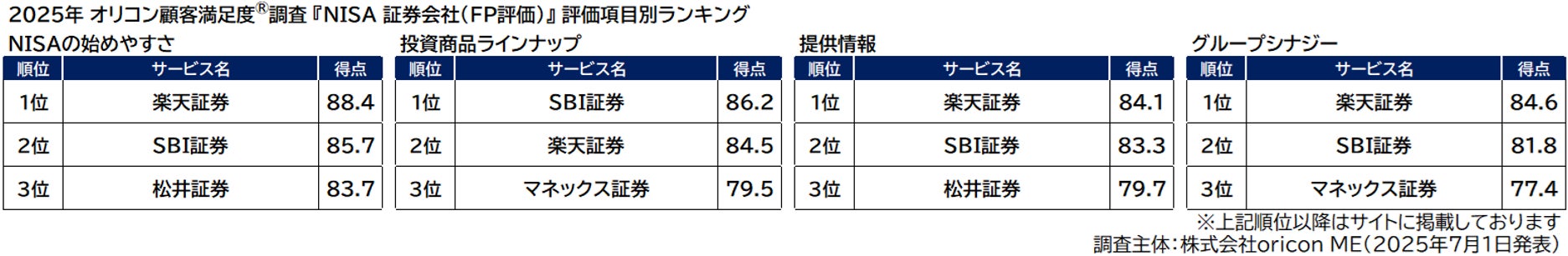 評価項目別では、「NISAの始めやすさ」「グループシナジー」のほか、“NISAに関する情報の充実さ”などを評価した「提供情報」の3項目で1位を獲得しました。